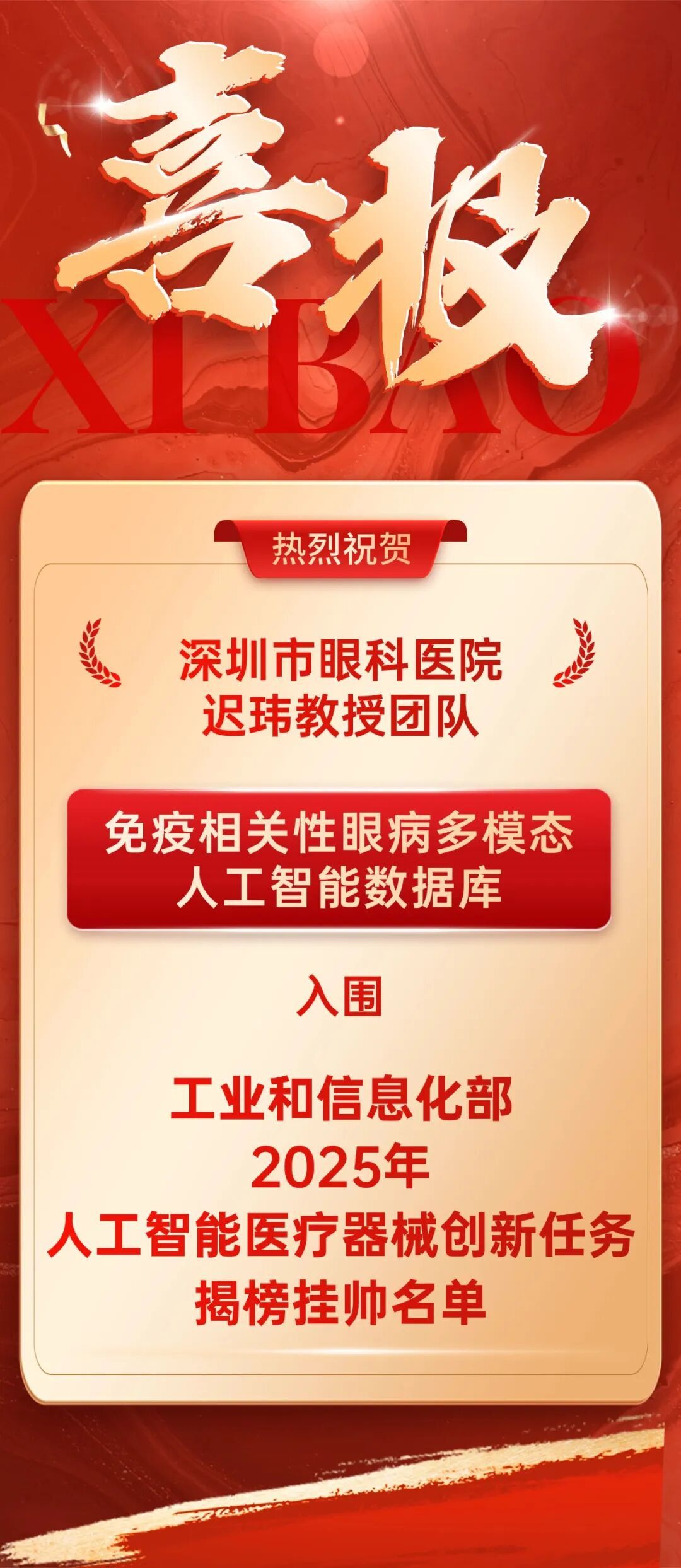 12月8日,工业和信息化部发布《2025年人工智能医疗器械创新任务揭榜挂帅入围单位公示》,深圳市眼科医院迟玮教授团队凭借“免疫相关性眼病多模态人工智能数据库”项目成功入围。作为本次深圳市唯一跻身榜单的医院,同时也是医学人工智能数据库入围的全国25家机构中唯一的眼科医院,本次入围标志着医院在“医工融合”创新道路上迈入全国先进行列,能够助力医疗人工智能尤其是人工智能眼健康的创新发展。