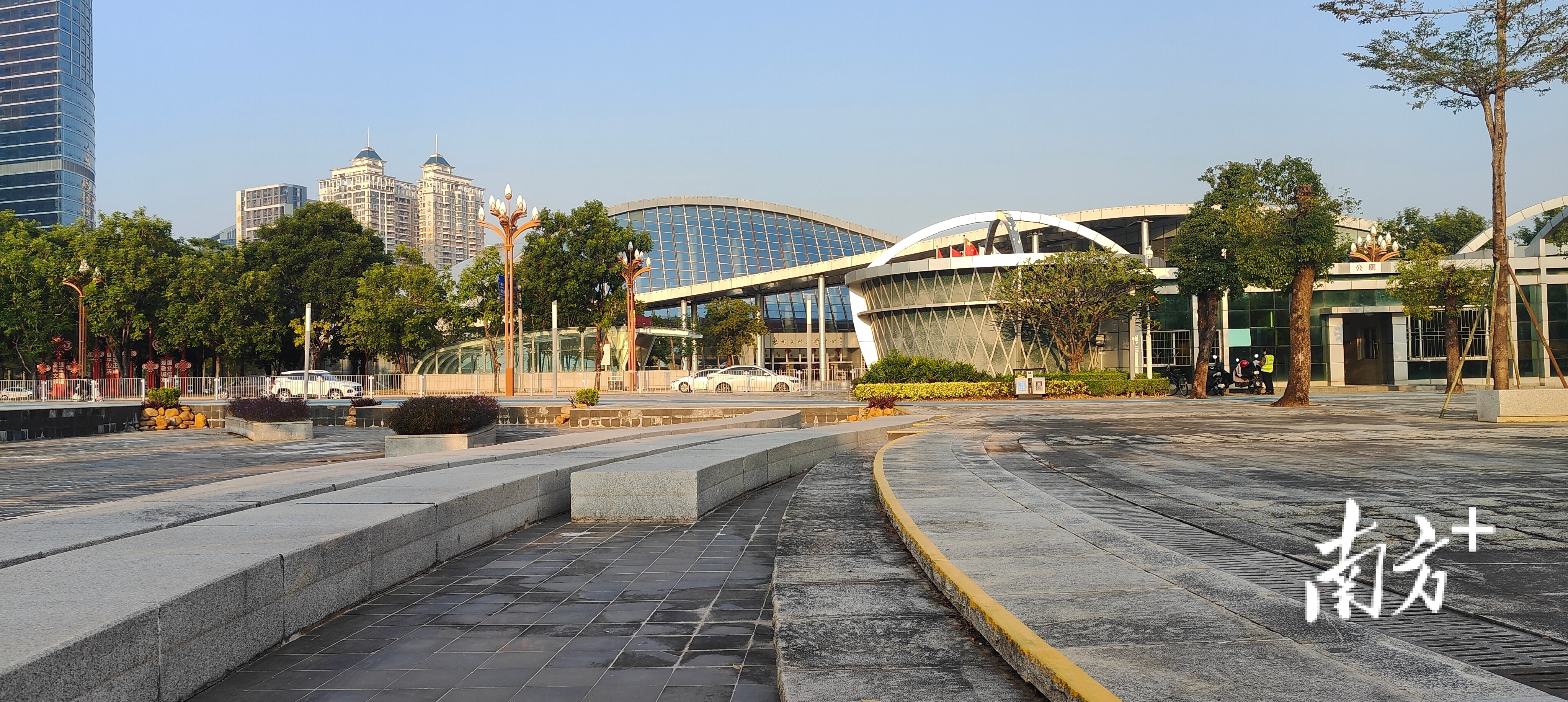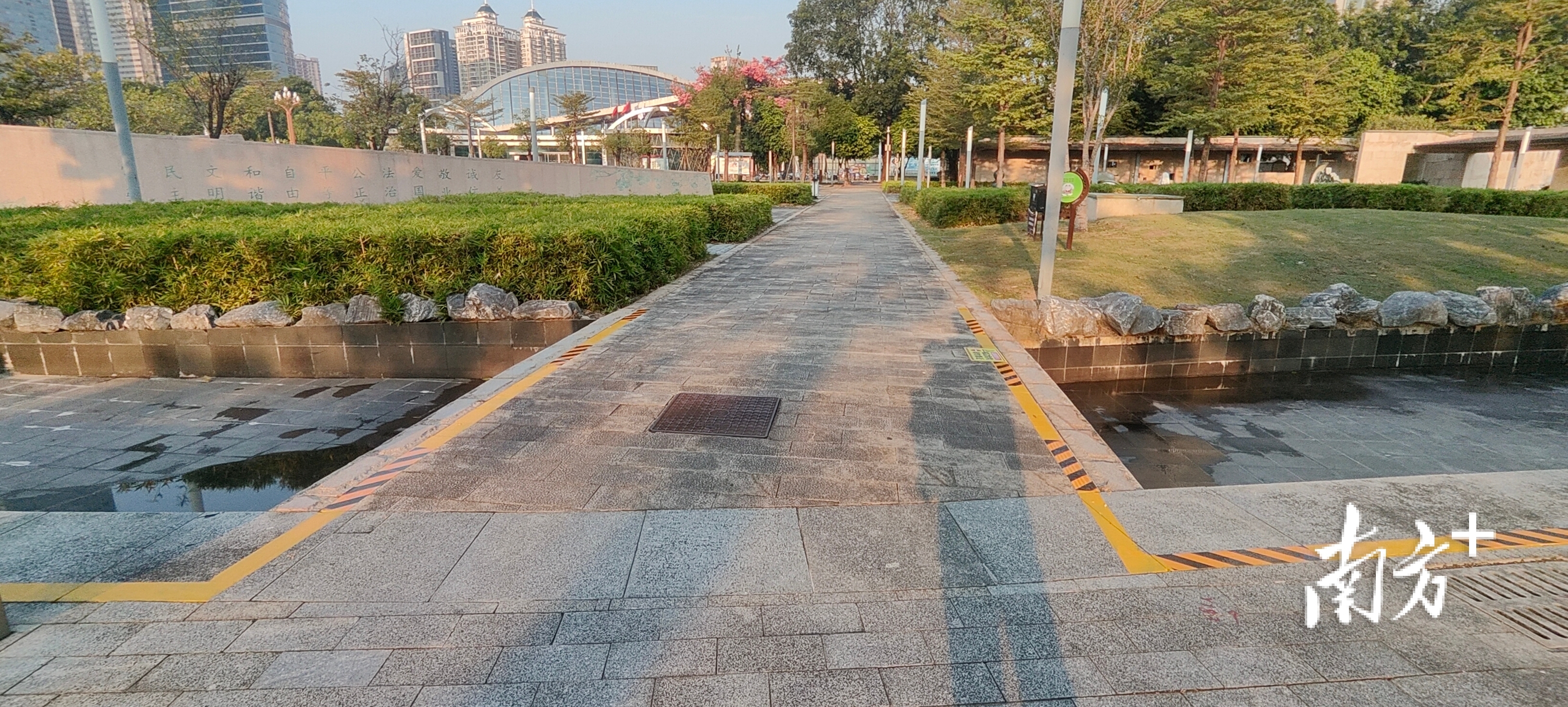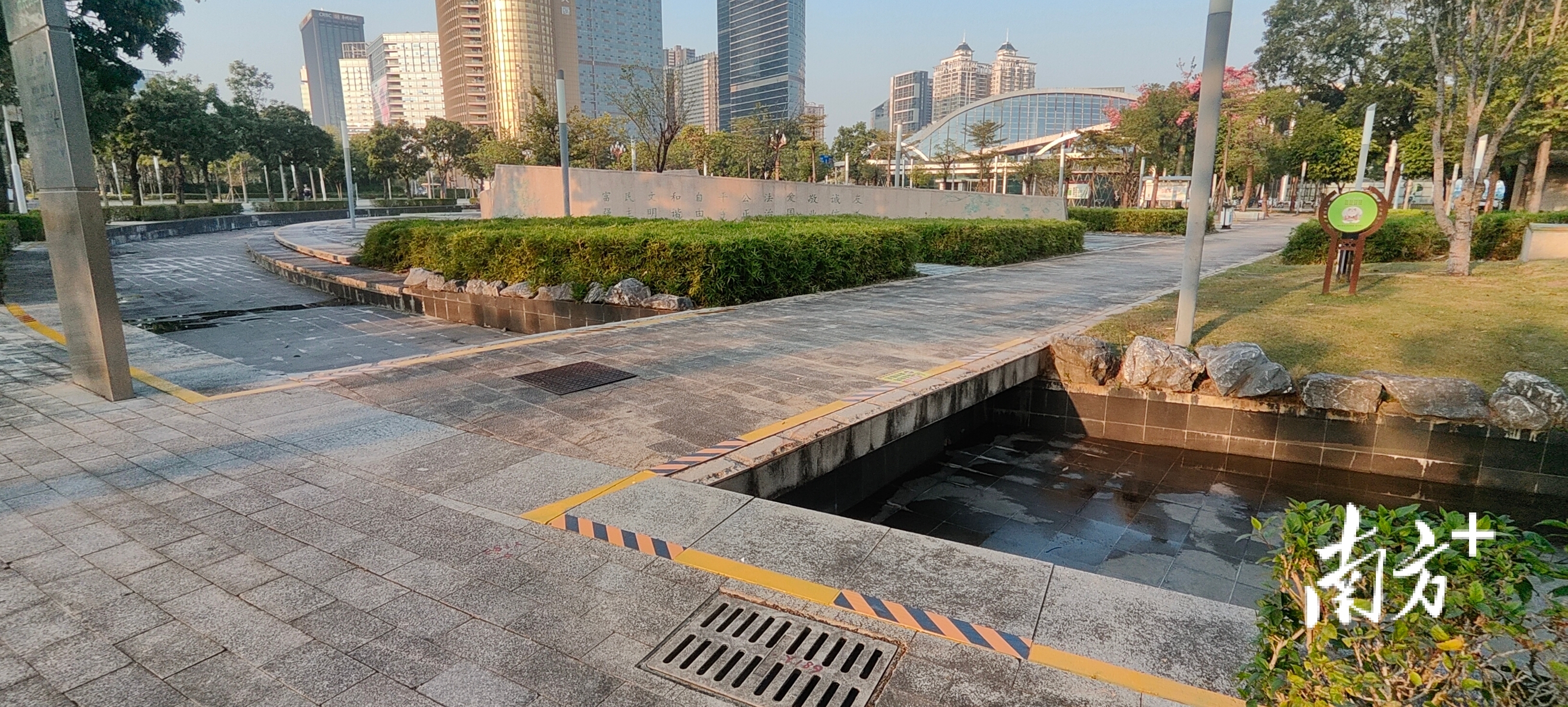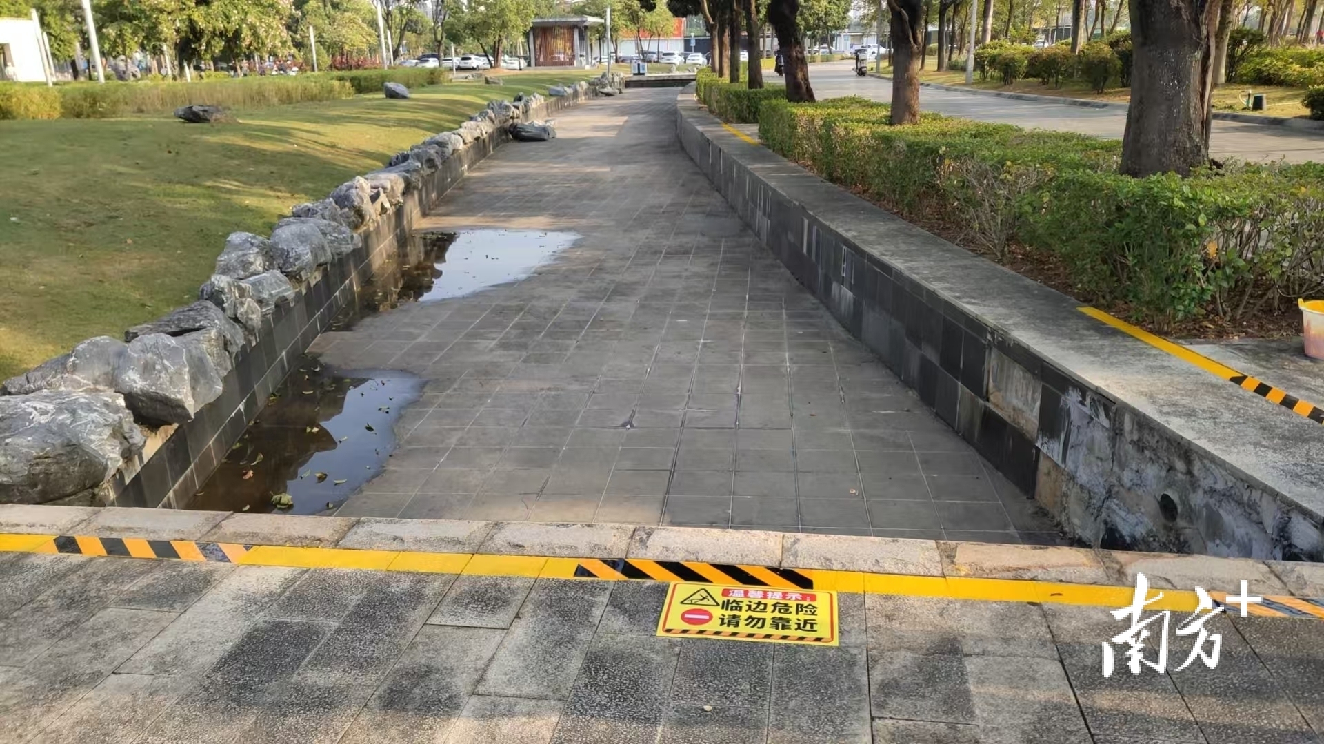 12月2日,南方+记者前往惠州市民公园进行走访。公园一期近惠州市文化艺术中心一侧的休闲片区设置有多个水泥水池,目前均处于干涸状态。公园地面与池底高差约50厘米,部分水池边缘无阶梯设置,也无任何防护标识。