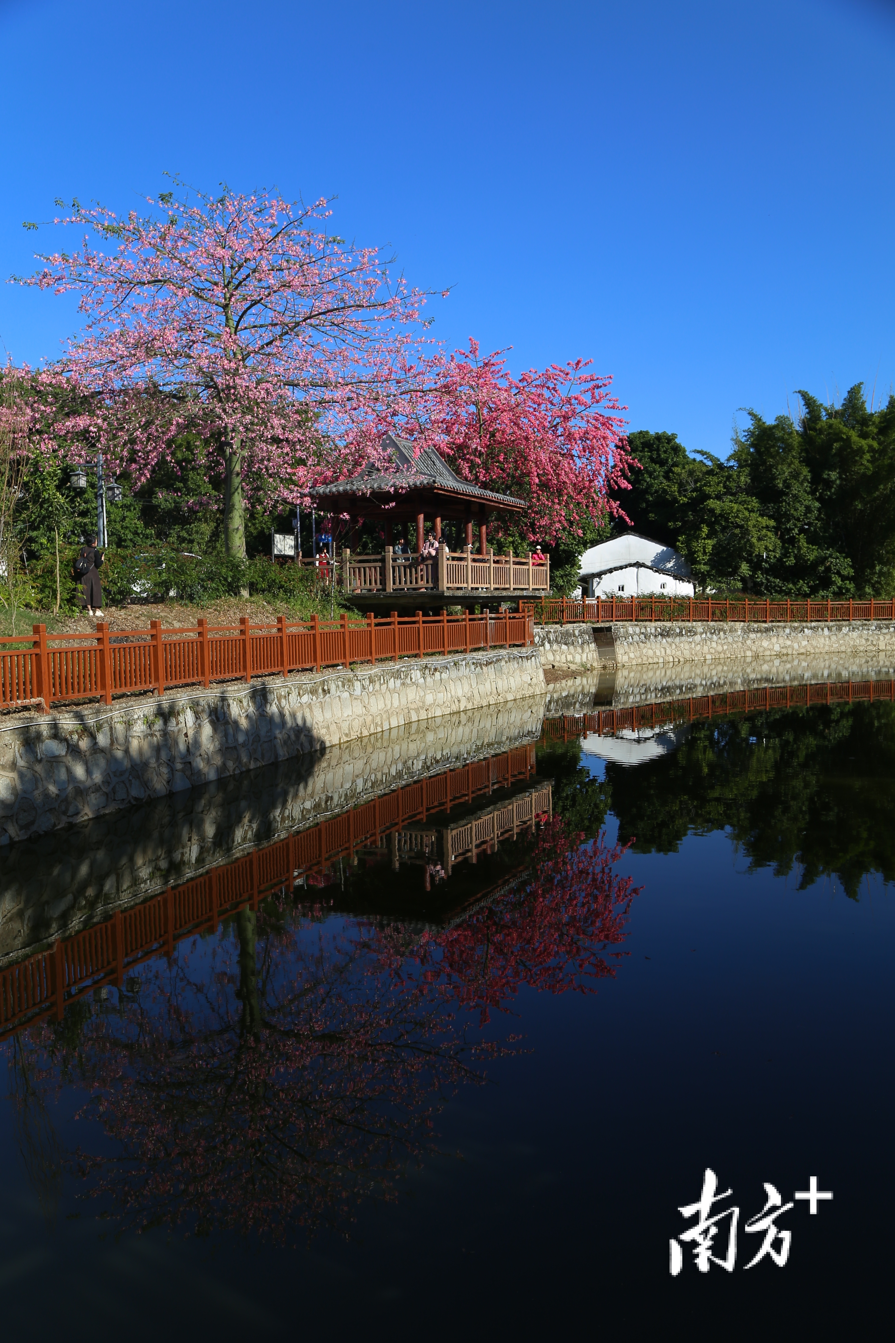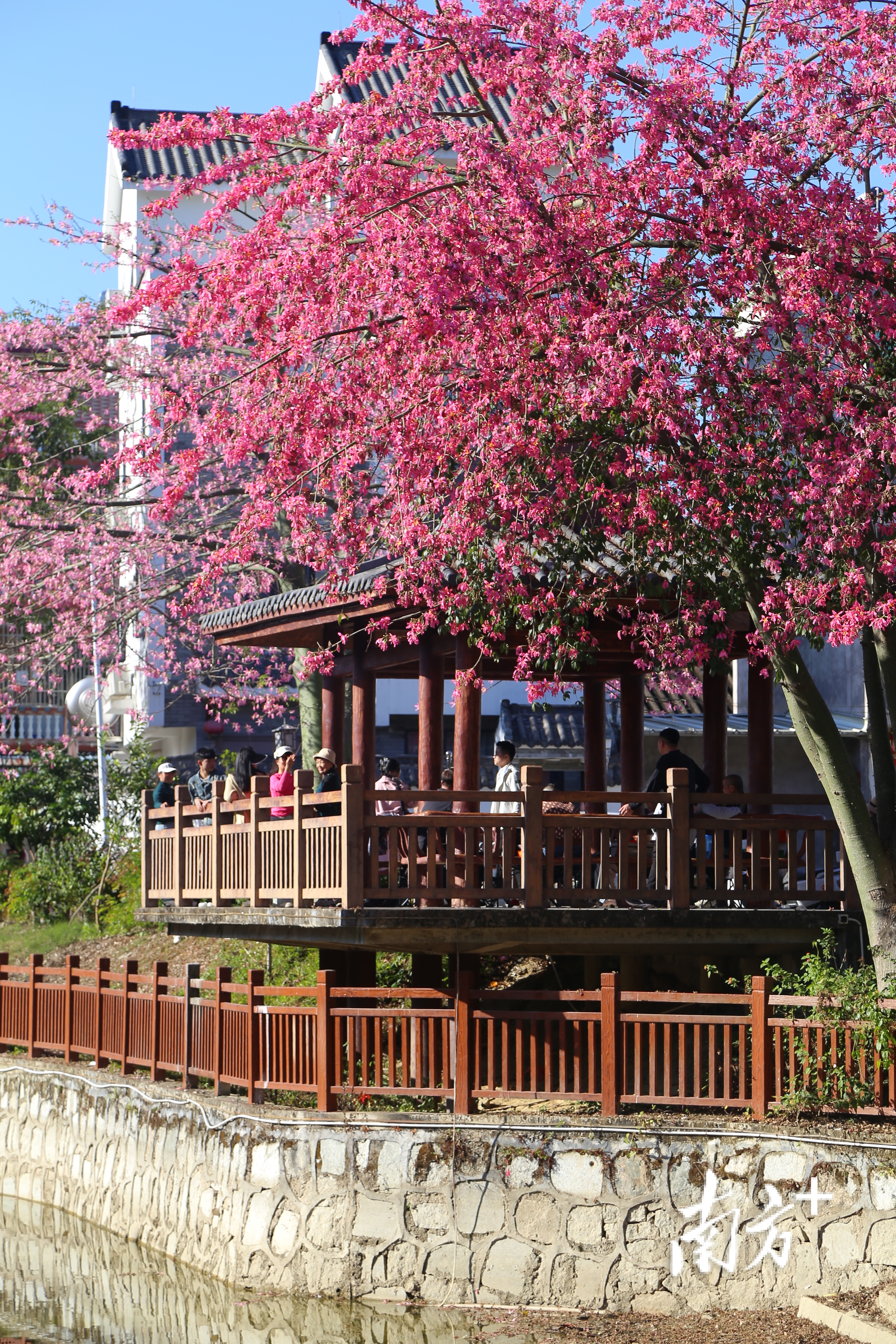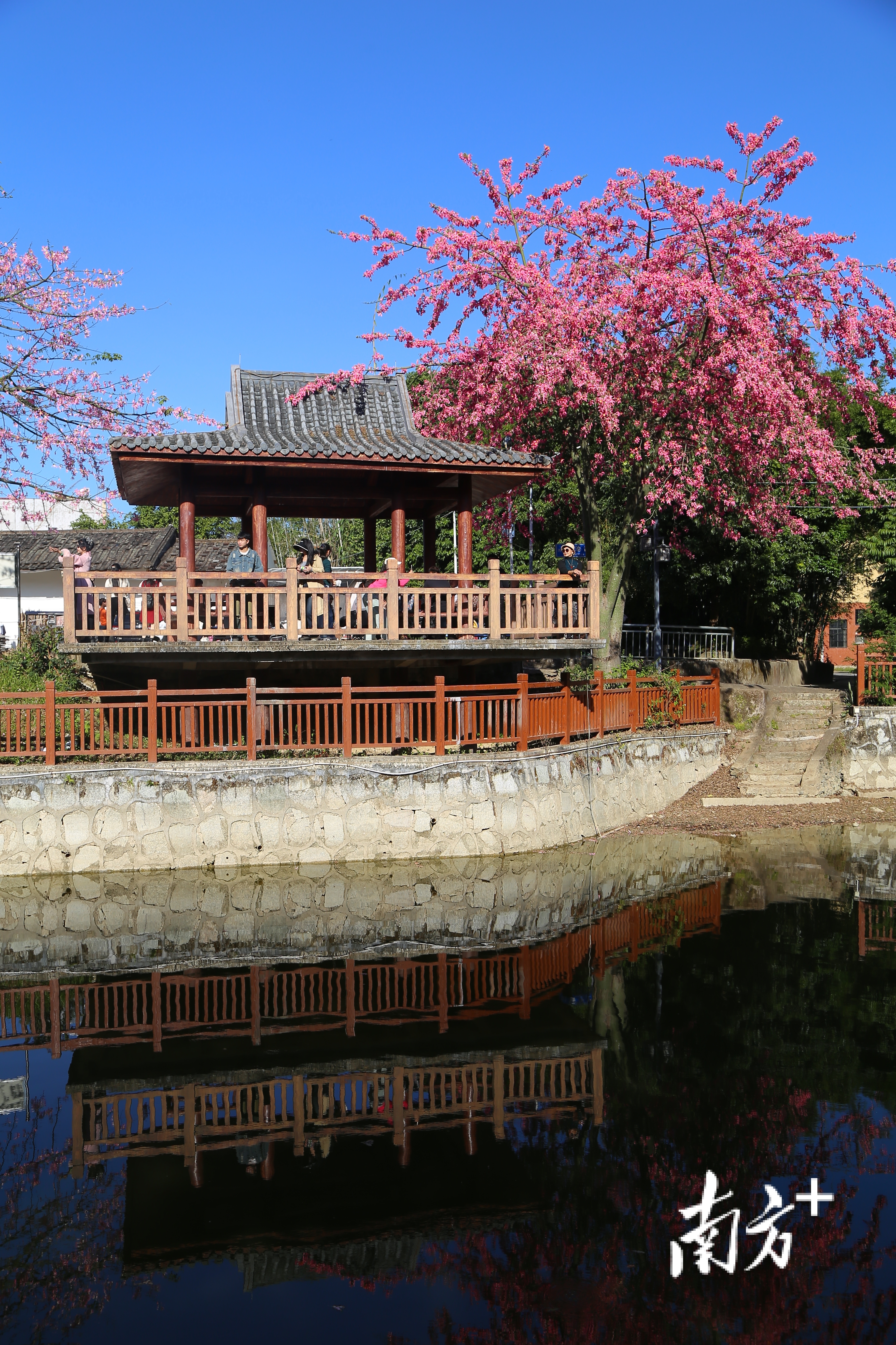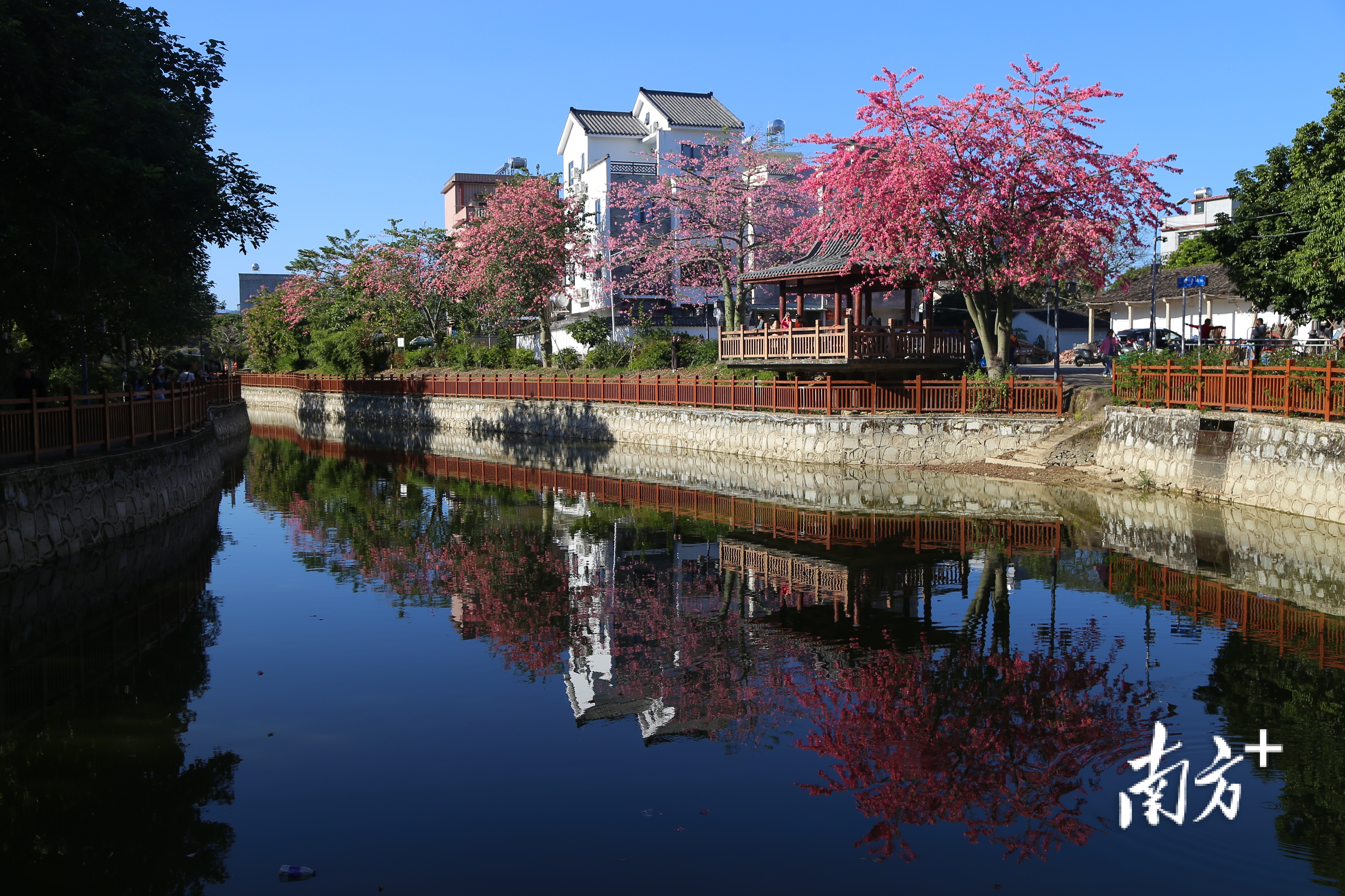 一湾碧水绕村社,满树红棉照楼台。近期,揭西县大溪镇大东村的异木棉盛开,被红花绿树环绕的滨水亭台每天吸引着众多游客前来拍照、休闲。