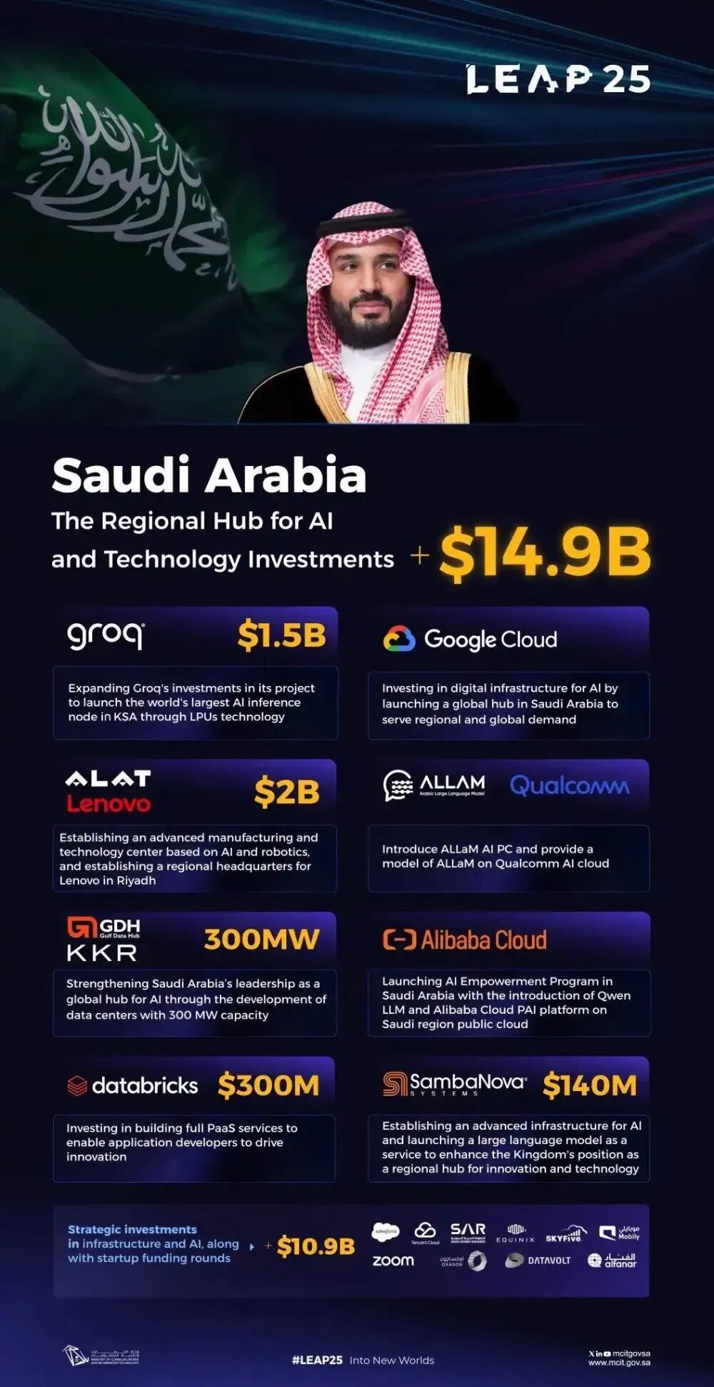 今年2月在沙特利雅得举办的LEAP 2025会议上,知名科技公司宣布投资149亿美元。