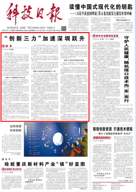 12月11日,《科技日报》头版头条刊发记者罗云鹏的文章《“创新三力”加速深圳跃升》,聚焦深圳坚持科技创新与产业创新融合实践,不断提升企业“驱动力”、产业“竞争力”和市场“影响力”,实现深圳创新“跟跑”到“领跑”的跃升。以下是全文。