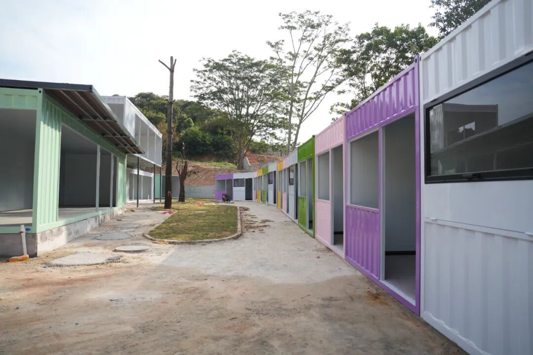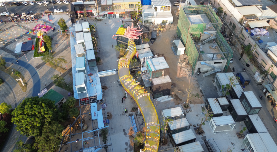 在施工现场,可以看到多个马卡龙色系的集装箱模块已陆续吊装就位,工人们正在进行绿化景观等作业,现场一派忙碌景象,一个充满活力的时尚集市已初显轮廓。