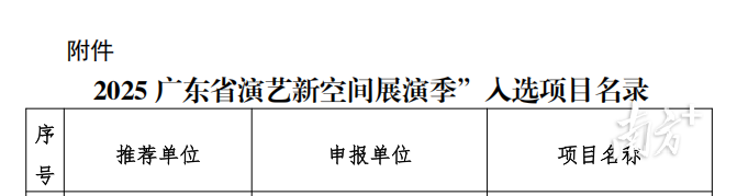 为配合全省开展“粤享暖冬 乐游广东”消费季活动,更好满足人民群众多样化、高品质的文化需求,推动广东演艺市场高质量发展,广东省文化和旅游厅于2025年12月中旬至2026年3月中旬开展 “2025广东省演艺新空间展演季”活动。经单位申报、组织推荐、集体评议,综合考量申报项目的市场定位、演出规模、内容形式、艺术水准、演艺创新程度以及与项目周边住宿餐饮、休闲运动、商贸文创等融合程度和消费拉动力度,共遴选出30个项目纳入此次活动。