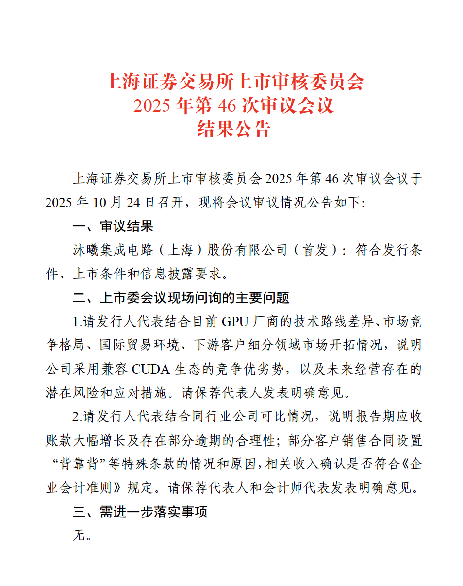 上市委会议现场问询的问题涉及:公司采用兼容英伟达CUDA 生态的竞争优劣势,以及未来经营存在的潜在风险和应对措施;报告期应收账款大幅增长及存在部分逾期的合理性等。
