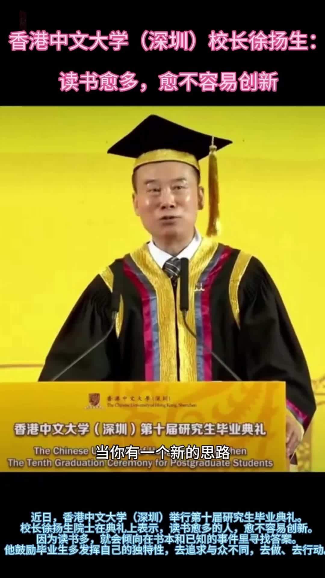 他在典礼上表示, 读书愈多,常常愈难创新。 “读书多,你会倾向于从书本和已知的事件里找答案,反而放弃独立思考。”徐扬生鼓励毕业生们“有创新思路时,要像爱护刚刚出生的孩子一样去保护她”——在创造之初,不要急于评判缺陷,要释放头脑,大胆尝试前所未有的事。他强调:“人生是旷野,不是轨道,要去做独一无二的自己。要去行动,要去做,你做什么,你就是什么。”