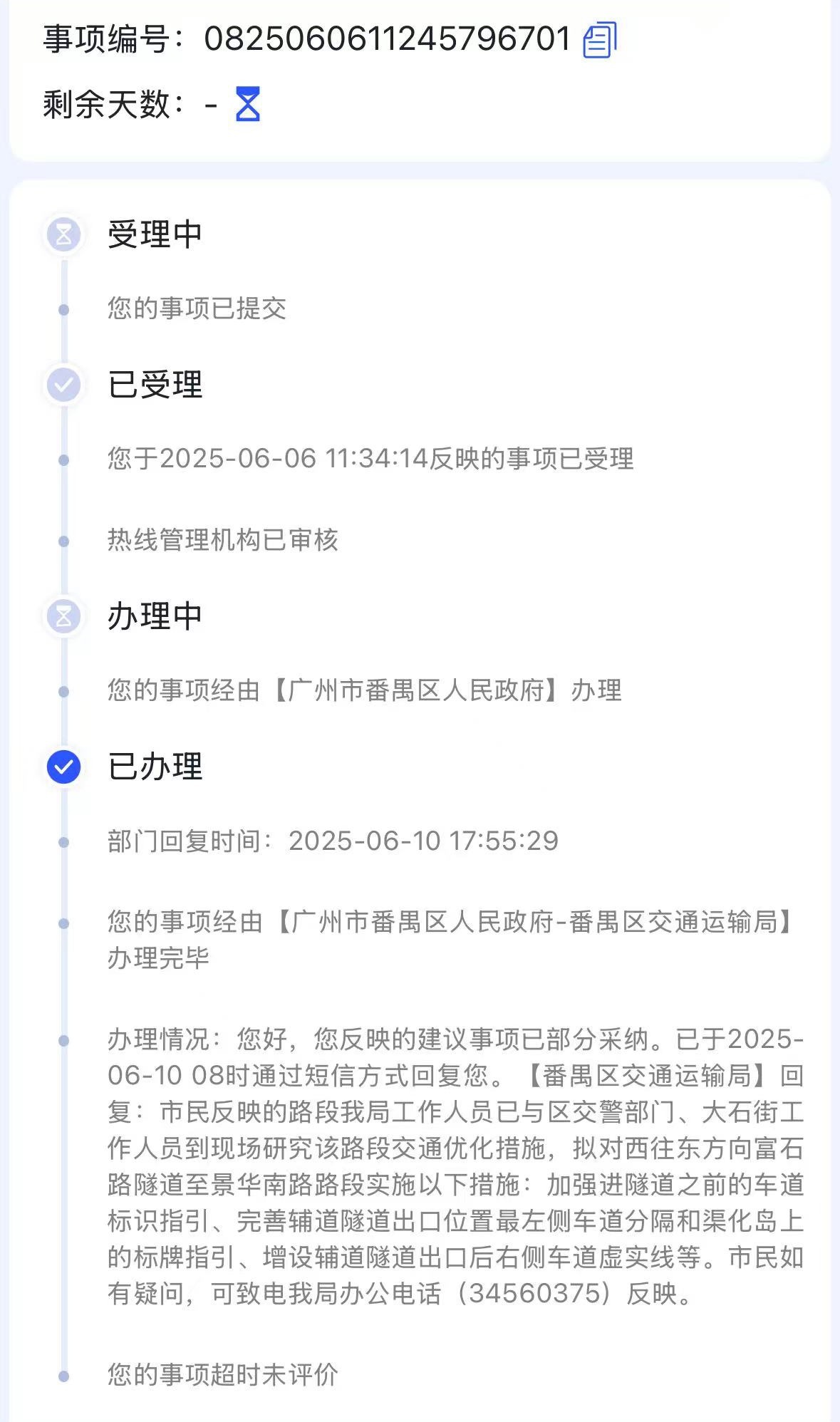 天河北路交通标识、南大干线富石隧道交通线修改、越秀区小北路立交桥下的指示牌设立……蒋大哥通过发布视频和拨打12345建议后,广州一批路面交通问题确实实现了“立即改”。