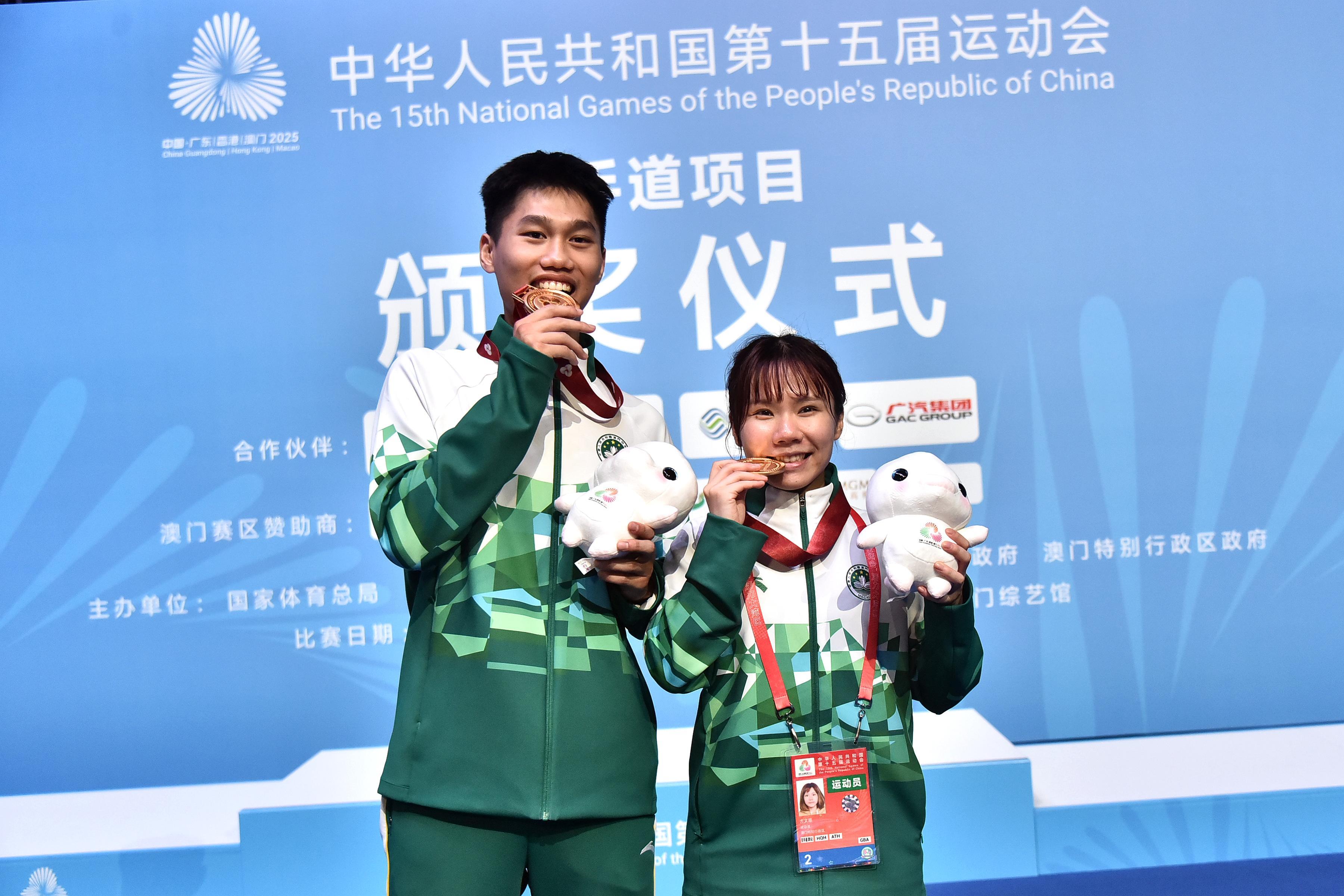 澳门空手道队容君灏(左)、方文慧(右)为澳门摘下两金。