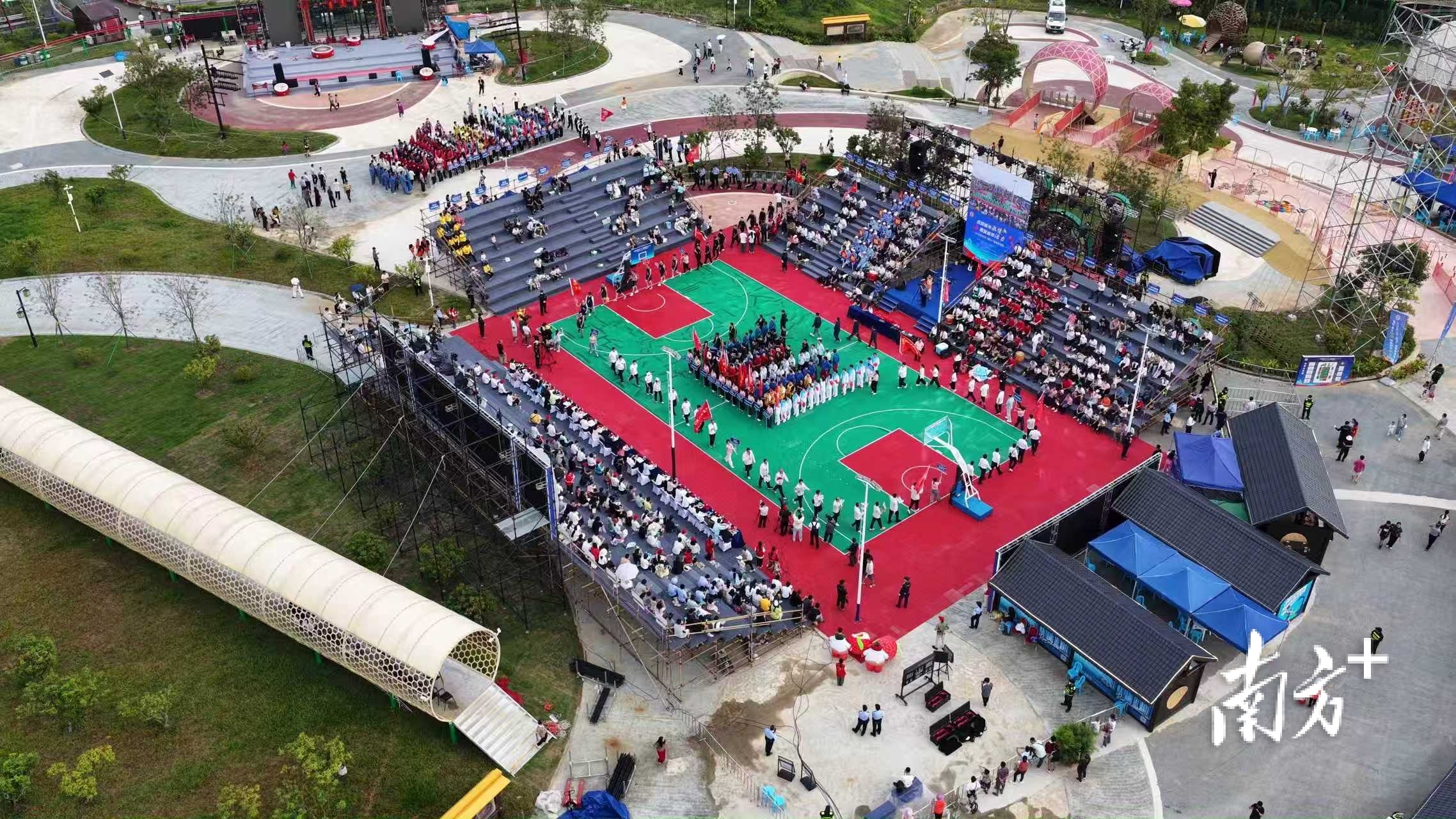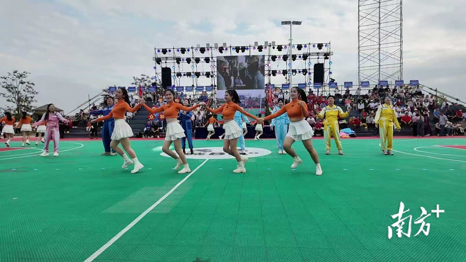 荔枝林间的崭新球场上,篮球撞击地面的铿锵声与观众呐喊声交织成这个夜晚最动人的旋律。《百千万双手》《活力啦啦操》与街舞《炫彩》轮番登场,动感的舞姿与赛场激情相互呼应。
