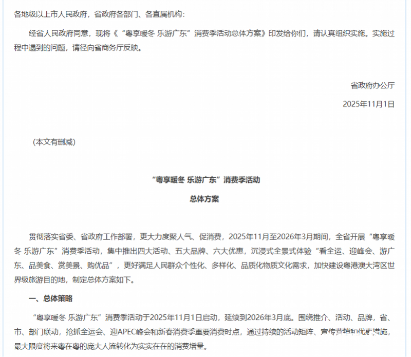 南都·湾财社记者获悉,11月3日,广东省政府官网公布的《“粤享暖冬 乐游广东”消费季活动总体方案》提到,从2025年11月1日到2026年3月底,将发放“广东优品购”消费券,对购车、购买8类家电产品、电子3C用品、6类体育用品等给予一次性补贴。