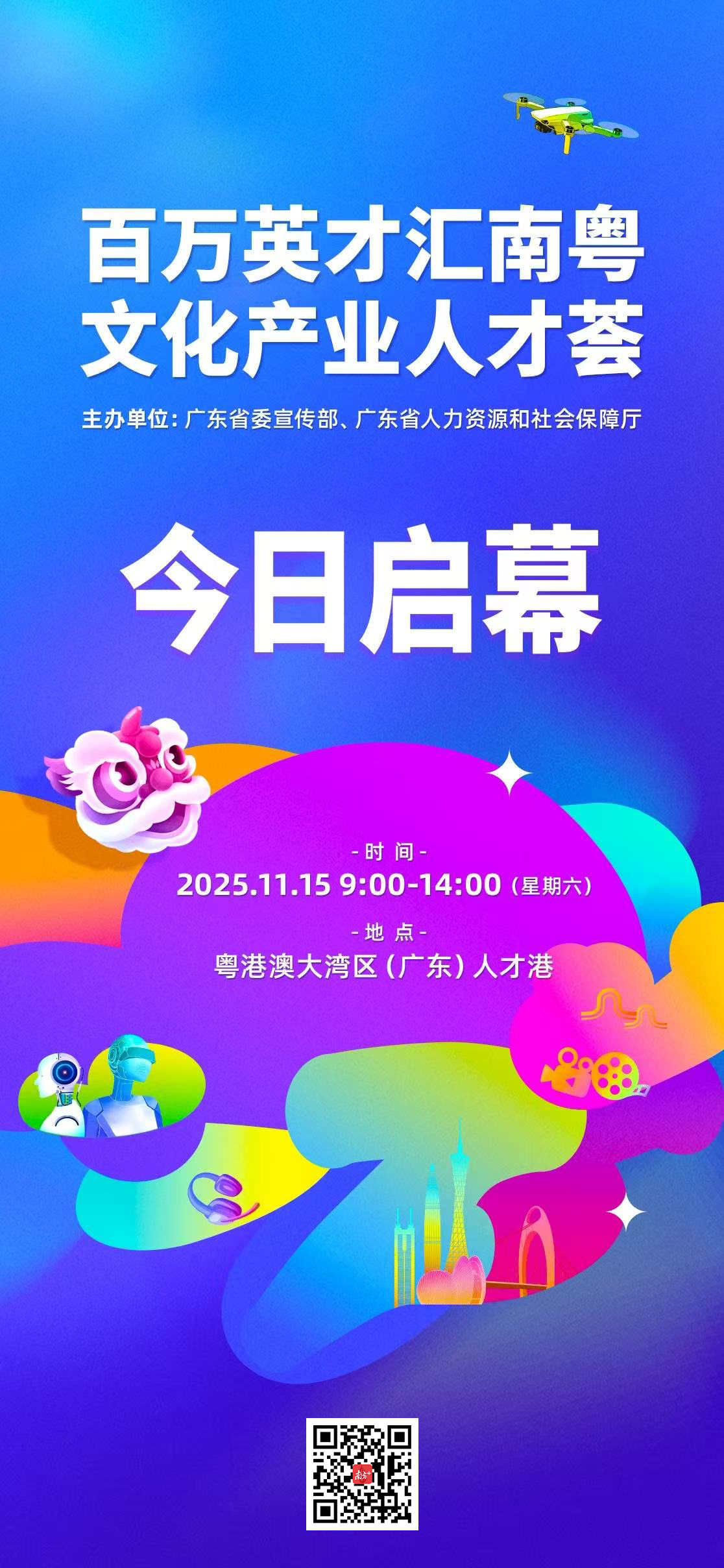 11月15日,由广东省委宣传部、广东省人力资源和社会保障厅联合主办的“百万英才汇南粤——文化产业人才荟”在粤港澳大湾区(广东)人才港启动。