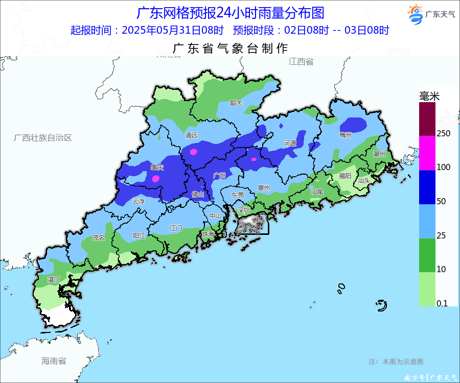 2日,粤北和珠三角中北部市县有大雨到暴雨局部大暴雨,雷雨时伴有8级左右的雷暴大风,其余市县有雷阵雨局部大雨或暴雨。最高气温:韶关北部、清远北部市县30~32℃,其余市县33~35℃。