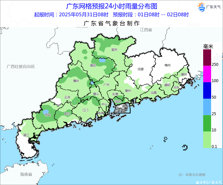 具体来看,6月1日,全省多云为主,部分市县有分散或局地(雷)阵雨。最高气温:粤西市县33~35℃,其余市县31~33℃。