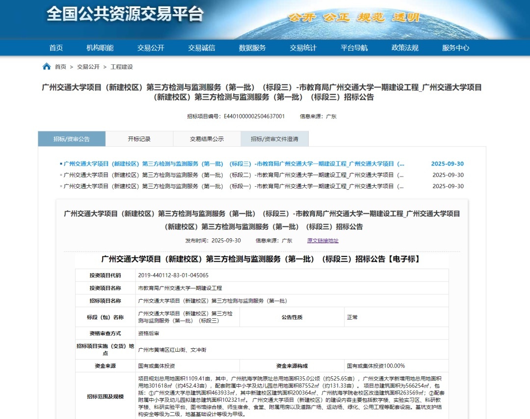 9月30日,全国公共资源交易平台发布了广州市教育局《广州交通大学一期建设工程_广州交通大学项目(新建校区)第三方检测与监测服务(第一批)招标公告》(含标段一、标段二、标段三)。