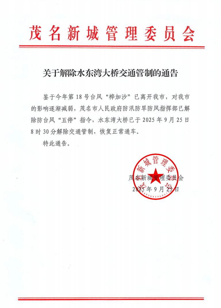 9月25日上午,随着今年第18号台风“桦加沙”对茂名市影响逐渐减弱,茂名新城管理委员会发布通告,宣布自2025年9月25日8时30分起,解除水东湾大桥的交通管制,全面恢复正常通车。同时,茂名新城管委会提醒过往车辆驾驶员,初期通行请留意路况,注意行车安全。