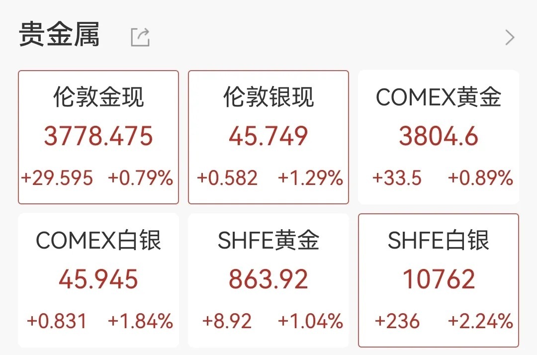 黄金盘中突然直线拉升,站上3780美元/盎司,涨幅约0.8%。截至23:00,伦敦金上涨0.79%,报3778.475美元/盎司,现货白银则涨逾1%。