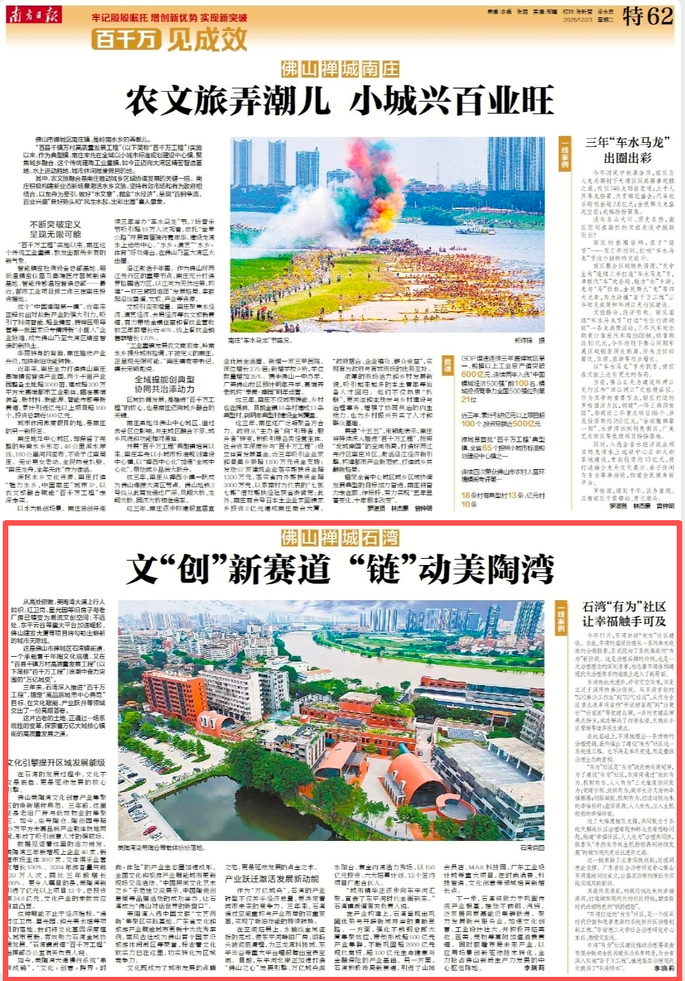 这是佛山市禅城区石湾镇街道,一个承载着千年陶文化底蕴,又在“百县千镇万村高质量发展工程”(以下简称“百千万工程”)浪潮中奋力突围的“万亿城央”。
