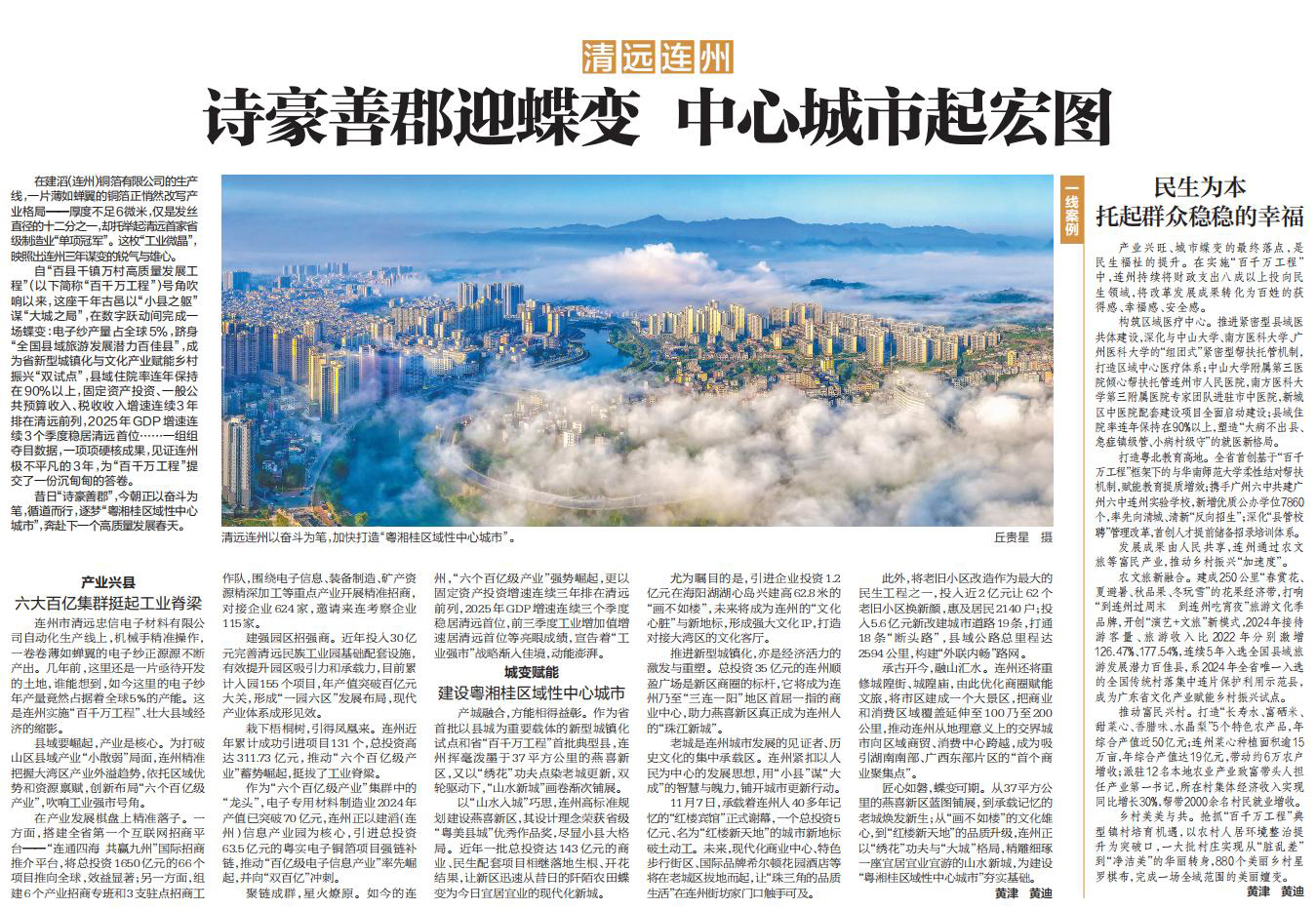 自“百县千镇万村高质量发展工程”(以下简称“百千万工程”)号角吹响以来,这座千年古邑以“小县之躯”谋“大城之局”,在数字跃动间完成一场蝶变:电子纱产量占全球5%,跻身“全国县域旅游发展潜力百佳县”,成为省新型城镇化与文化产业赋能乡村振兴“双试点”,县域住院率连年保持在90%以上,固定资产投资、一般公共预算收入、税收收入增速连续3年排在清远前列,2025年GDP增速连续3个季度稳居清远首位……一组组夺目数据,一项项硬核成果,见证连州极不平凡的3年,为“百千万工程”提交了一份沉甸甸的答卷。