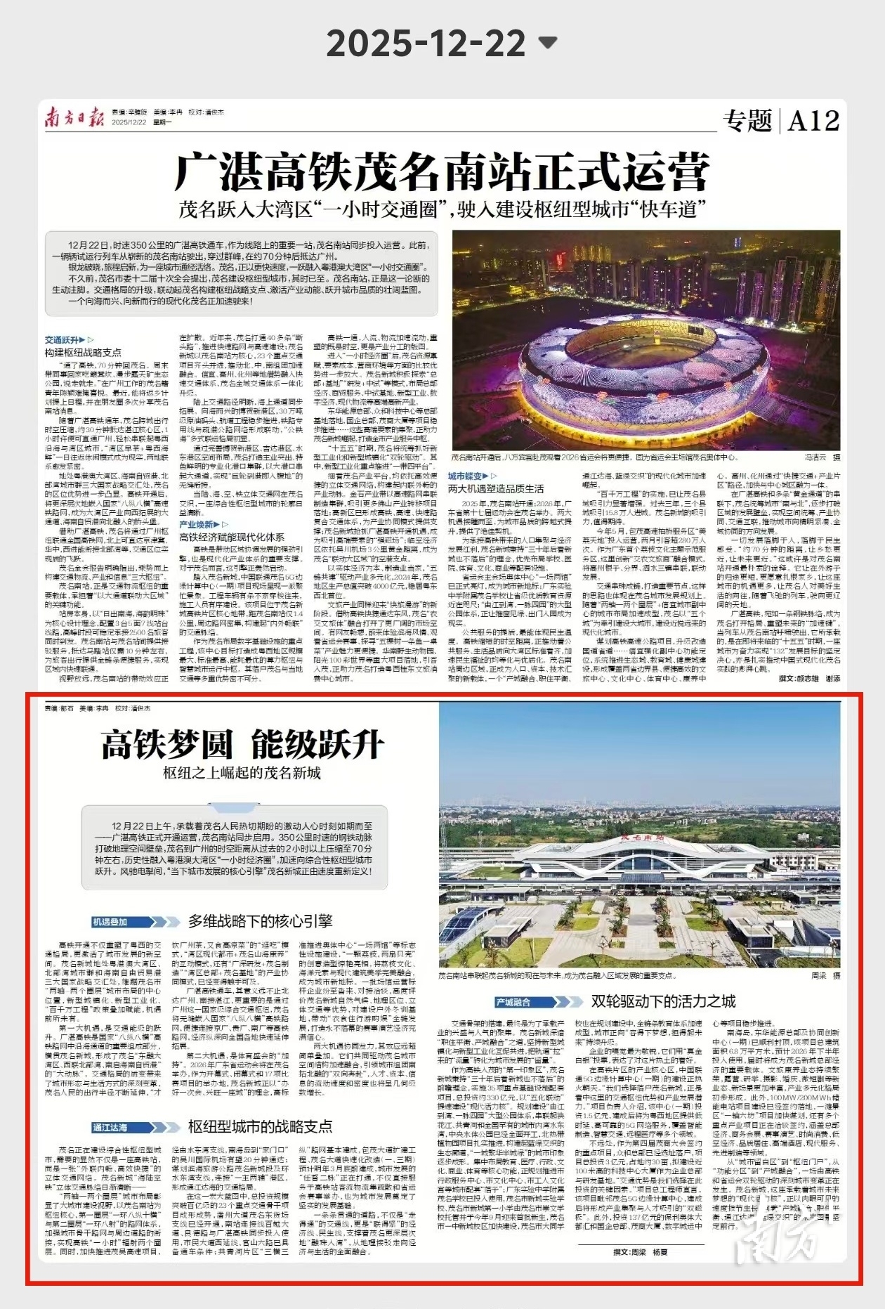 12月22日上午,承载着茂名人民热切期盼的激动人心时刻如期而至——广湛高铁正式开通运营,茂名南站同步启用。350公里时速的钢铁动脉打破地理空间壁垒,茂名到广州的时空距离从过去的2小时以上压缩至70分钟左右,历史性融入粤港澳大湾区“一小时经济圈”,加速向综合性枢纽型城市跃升。风驰电掣间,“当下城市发展的核心引擎”茂名新城正由速度重新定义!