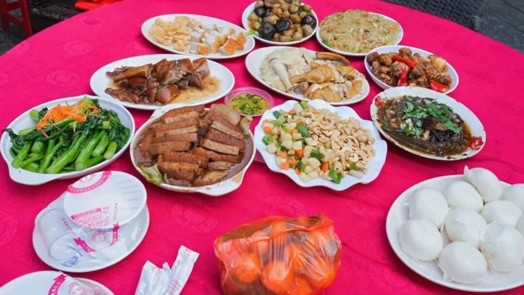 冬祭仪式礼成后,黄氏族人联谊聚餐,筵开288围,近3000人共食“九大簋”,菜肴为“三扣、三硬、三小炒”,现场欢声笑语,其乐融融。