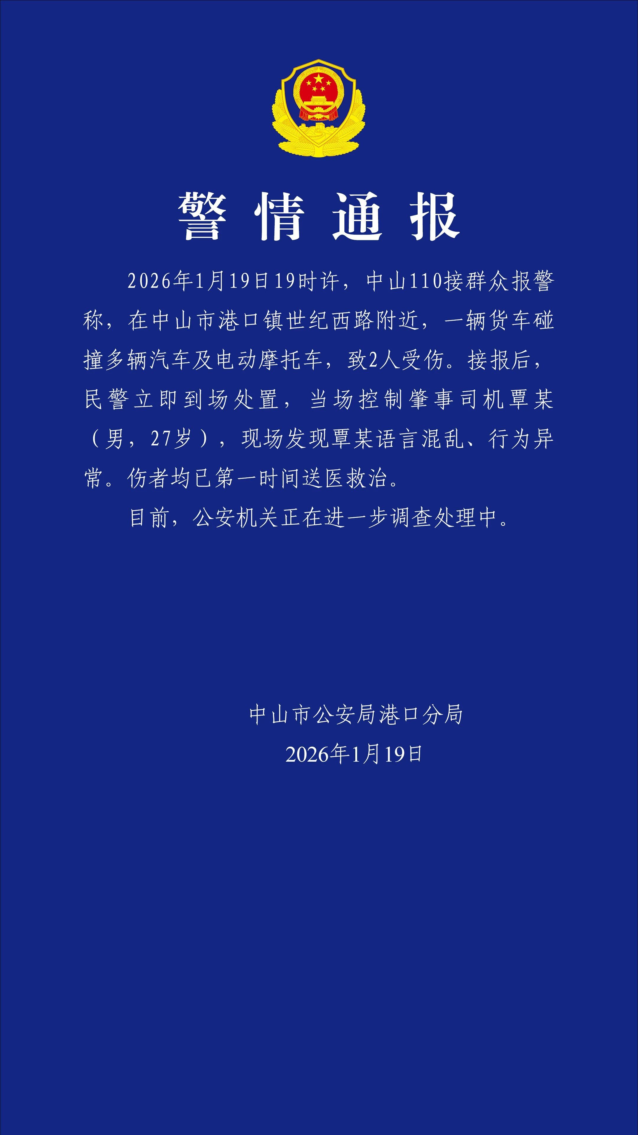 据中山市公安局港口分局通报,1月19日19时许,中山110接群众报警称,在中山市港口镇世纪西路附近,一辆货车碰撞多辆汽车及电动摩托车,致2人受伤。接报后,民警立即到场处置,当场控制肇事司机覃某(男,27岁),现场发现覃某语言混乱、行为异常。伤者均已第一时间送医救治。