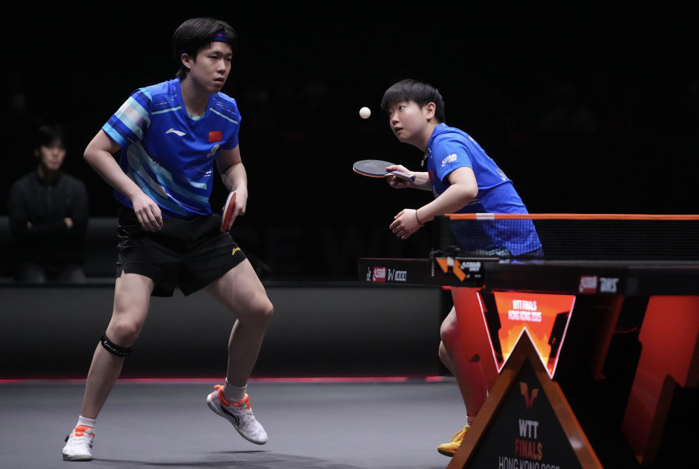 12月13日,在香港进行的2025年世界乒乓球职业大联盟(WTT)总决赛混双决赛中,中国组合王楚钦/孙颖莎0比3不敌韩国组合林仲勋/申裕斌,获得亚军。图为王楚钦/孙颖莎(右)在比赛中。 新华社发(吕小炜摄)