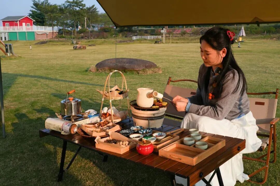 或在露营区的天幕帐篷下体验围炉煮茶,