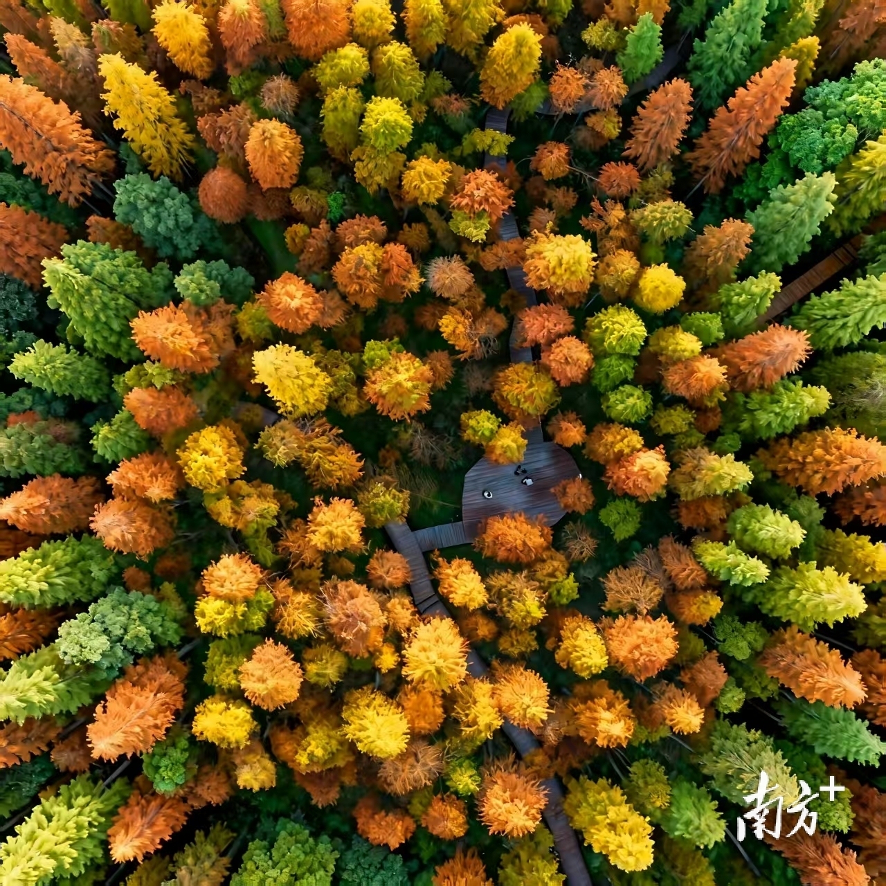 在广东天井山国家森林公园,30亩落羽杉红、黄、绿交织,宛如打翻了的颜料盘,11月起进入显色期,12月色彩最为浓郁,可观赏到“多彩森林”。此外,园内还分布阔叶林彩林约2万亩,主要的彩叶树种有山乌桕、枫香、漆树、盐肤木等。受海拔与树种差异影响,天井山的赏叶季通常从每年10月启动,持续至12月底。