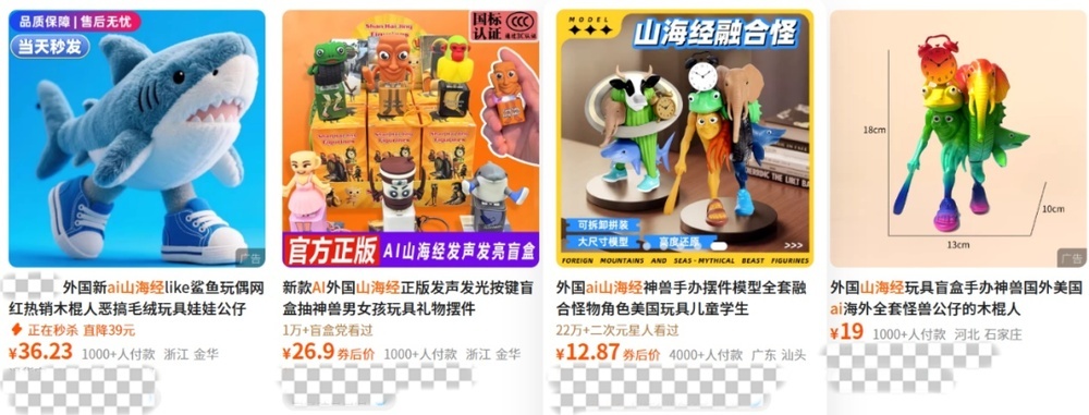 记者留意到,在一些电商平台上,搜索“外国山海经”会自动关联出大量相关词条。除了以这些AI动画形象为原型制作的玩具、手办外,还有文具、漫画书、生活用品等等,不少商品页面显示“已售10万+”。一些学校周边的文具店、超市、玩具店,也有“外国山海经”相关玩具在售。
