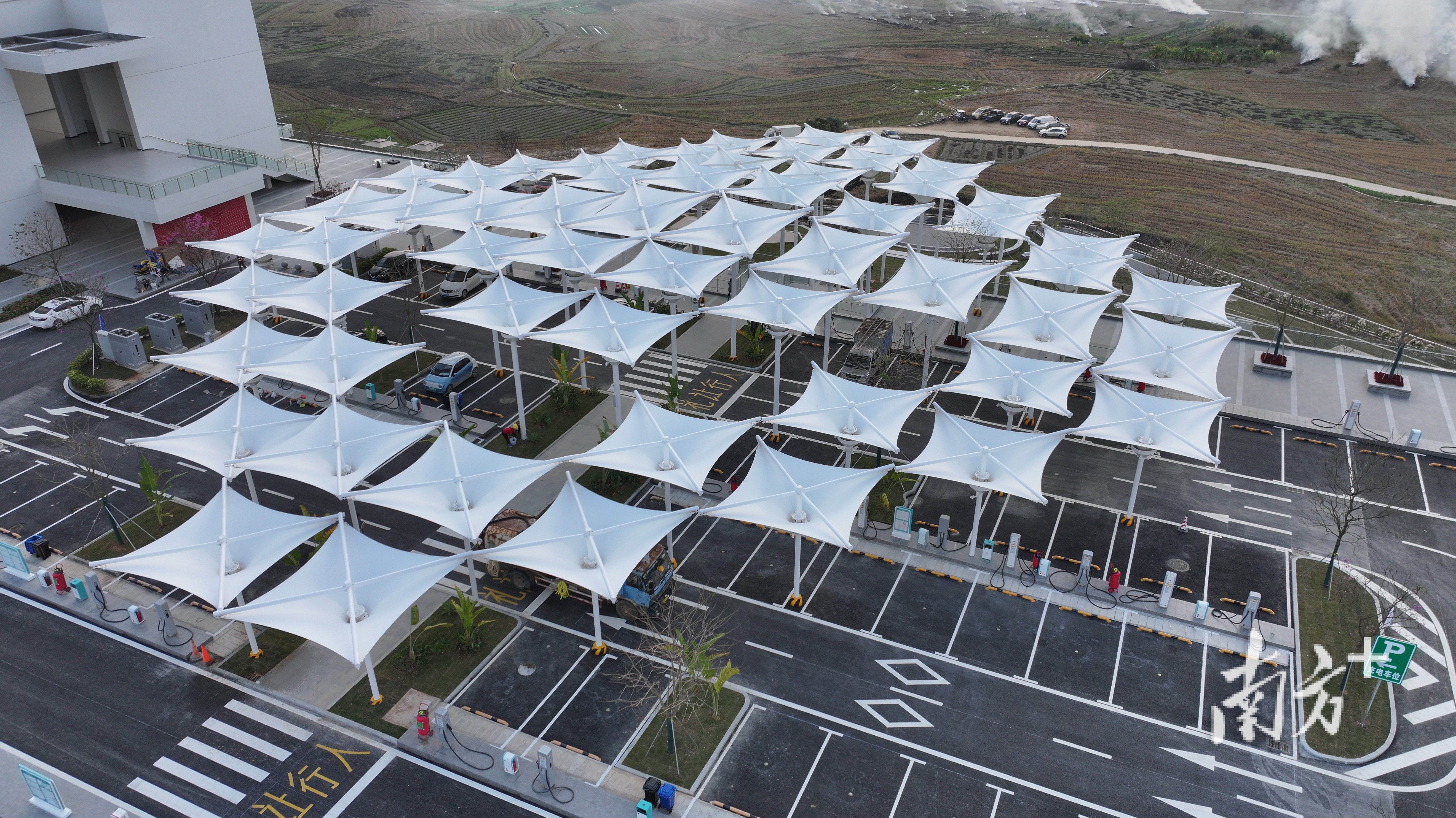 面对新能源出行浪潮,服务区打造公园式充电站,配备100个快充/超充车位,群“伞”式顶棚充满科技感,搭配绿植营造出逛公园般的轻松体验。
