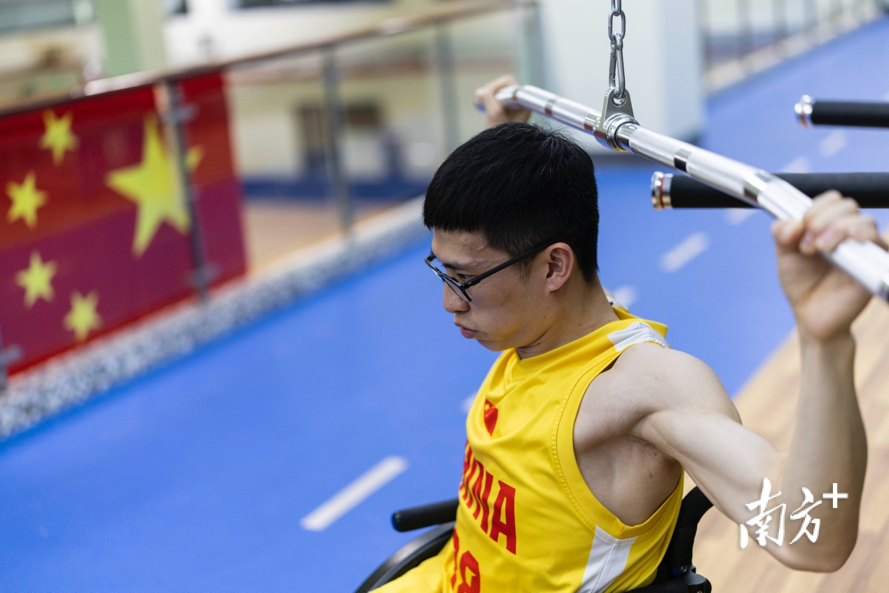力量房中,轮椅男篮队长黄坤洪正在进行高位下拉练习,增强背部肌肉力量加强对抗能力。