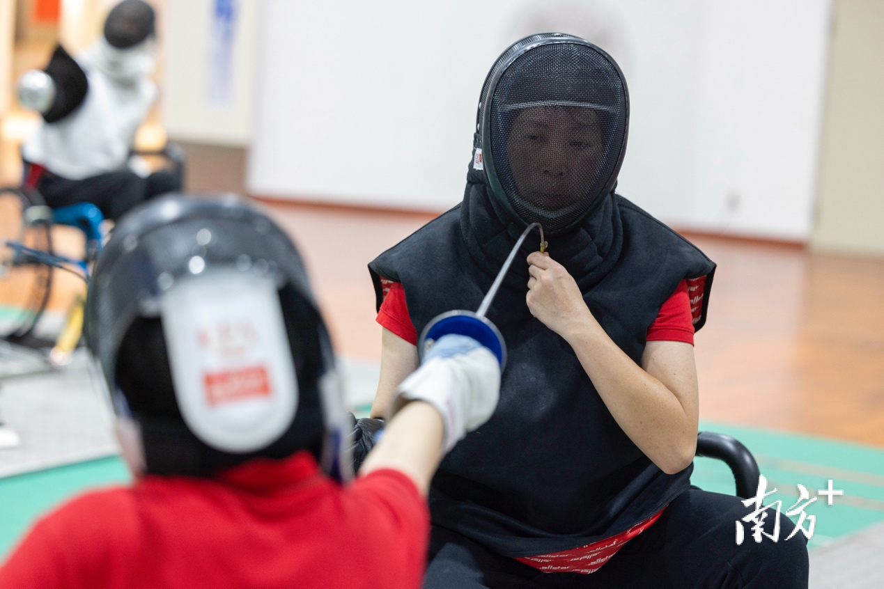 训练场馆里,轮椅击剑运动员一手持剑,一手扶轮椅,反复练习刺击动作……