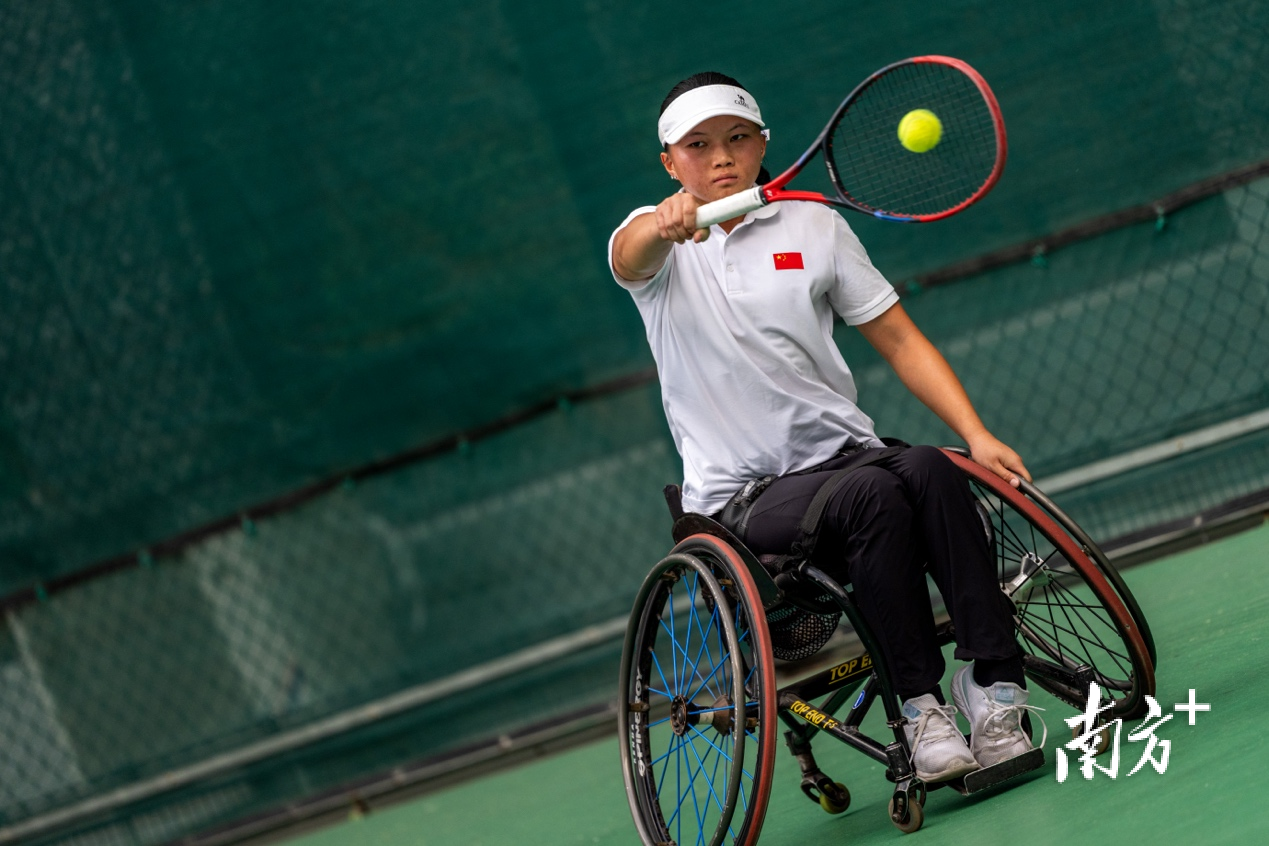 轮椅网球日常训练中,队员梁晓童从容接球。