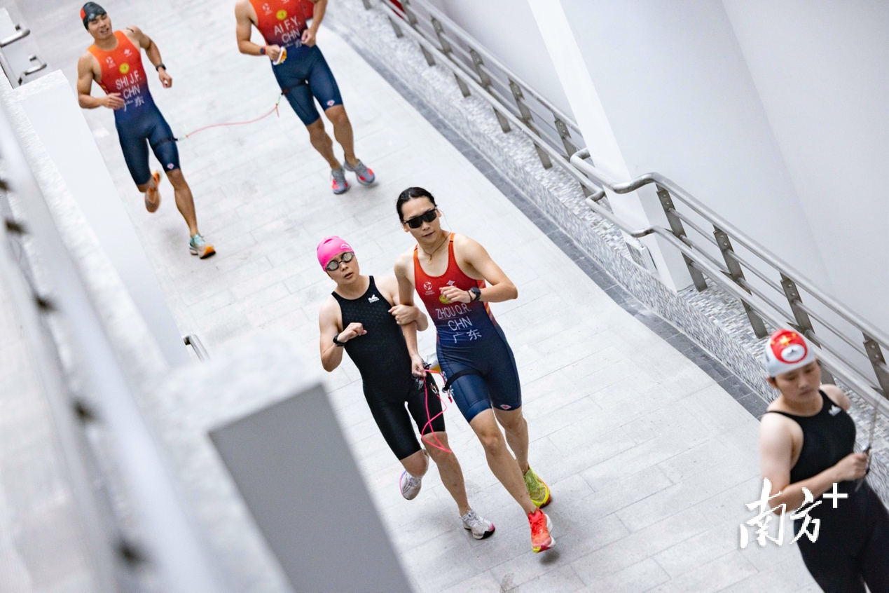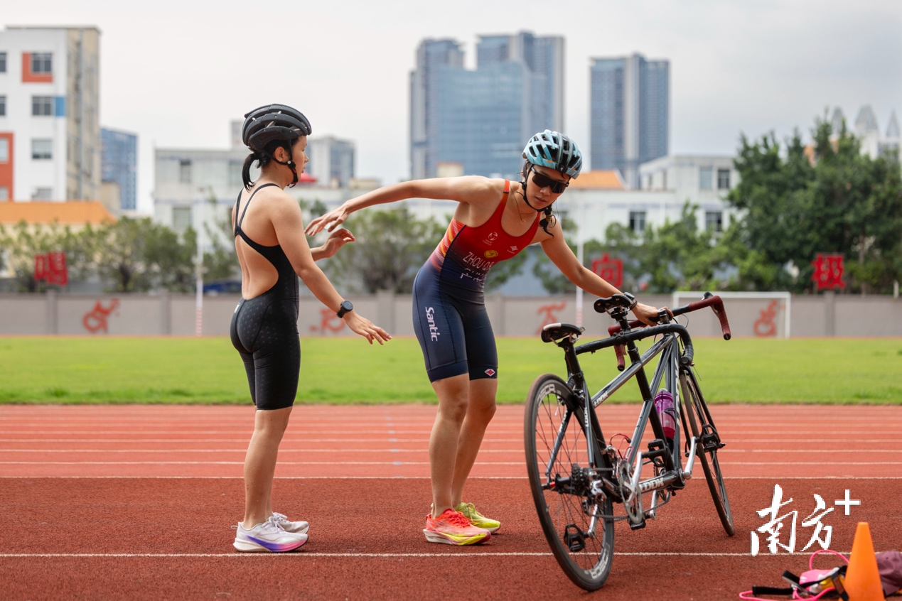 铁人三项换项练习过程中,健全人引导员周倩如(右)协助残障队友陈芊(左)迅速找到位置,共同上车。
