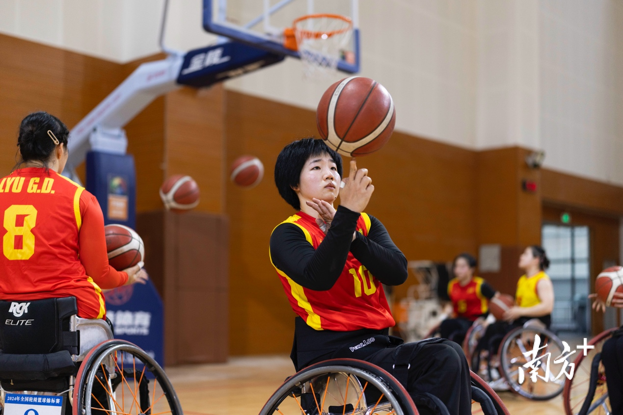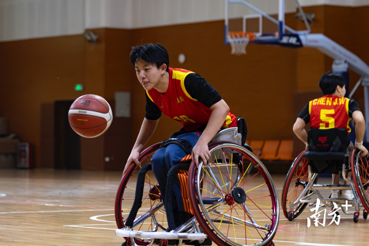 篮球场上,广东省轮椅篮球队的队员们边运球、边操控着轮椅前进或刹车,传球、防守、投篮,所有动作一气呵成。