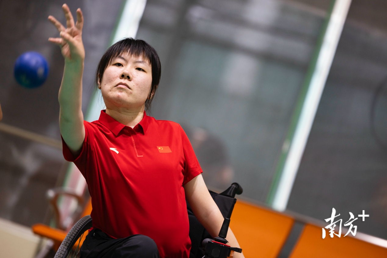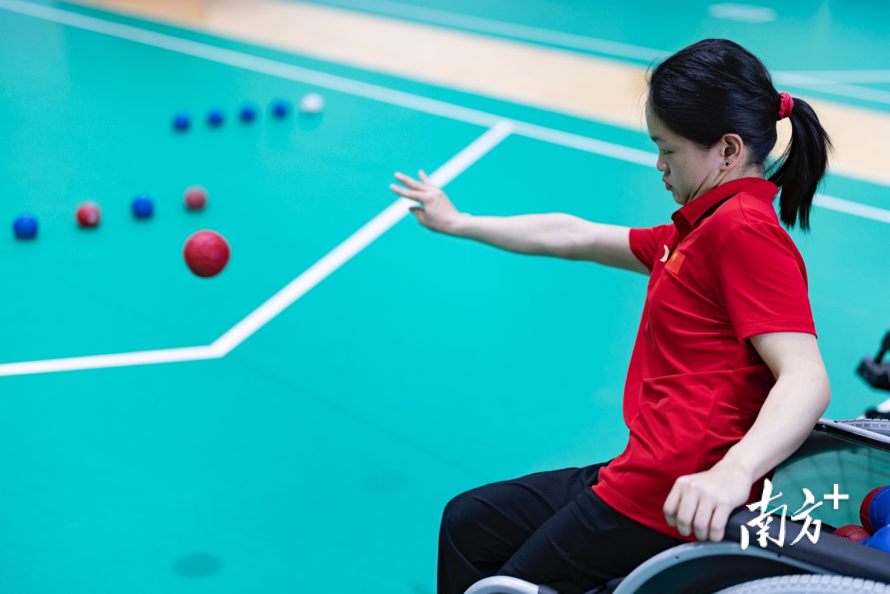 瞄准目标白球,一次次挥动手臂,在重复训练中让投球的落点更加精准……在广州市残疾人体育运动中心,硬地滚球队运动员林细妹正在投入紧张的训练中。
