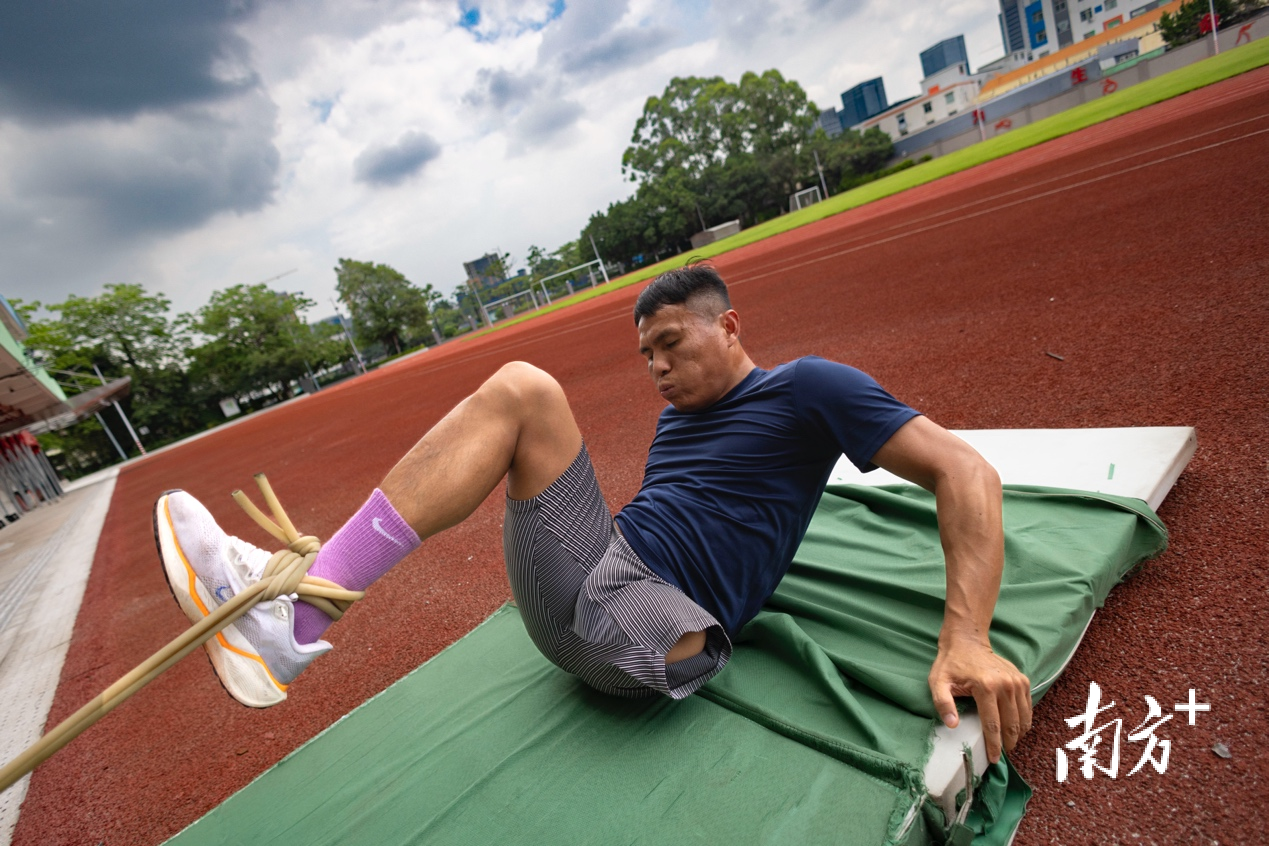 35岁的田径独腿老将钟志强每日坚持用弹力带拉伸腿部双侧链,保持肌肉弹性。
