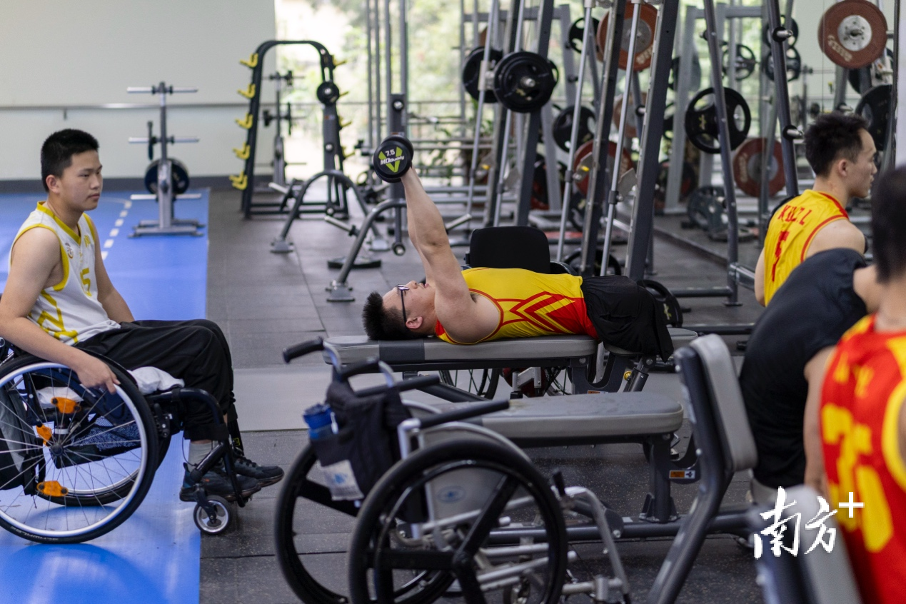 力量房中,轮椅男篮队员秦旭磊(左二)正在进行平板哑铃卧推。这位早年失去双腿的年轻球员的故事曾被已故篮球巨星科比点赞,今年他将力争在残特奥会上携同队友们为广东卫冕。