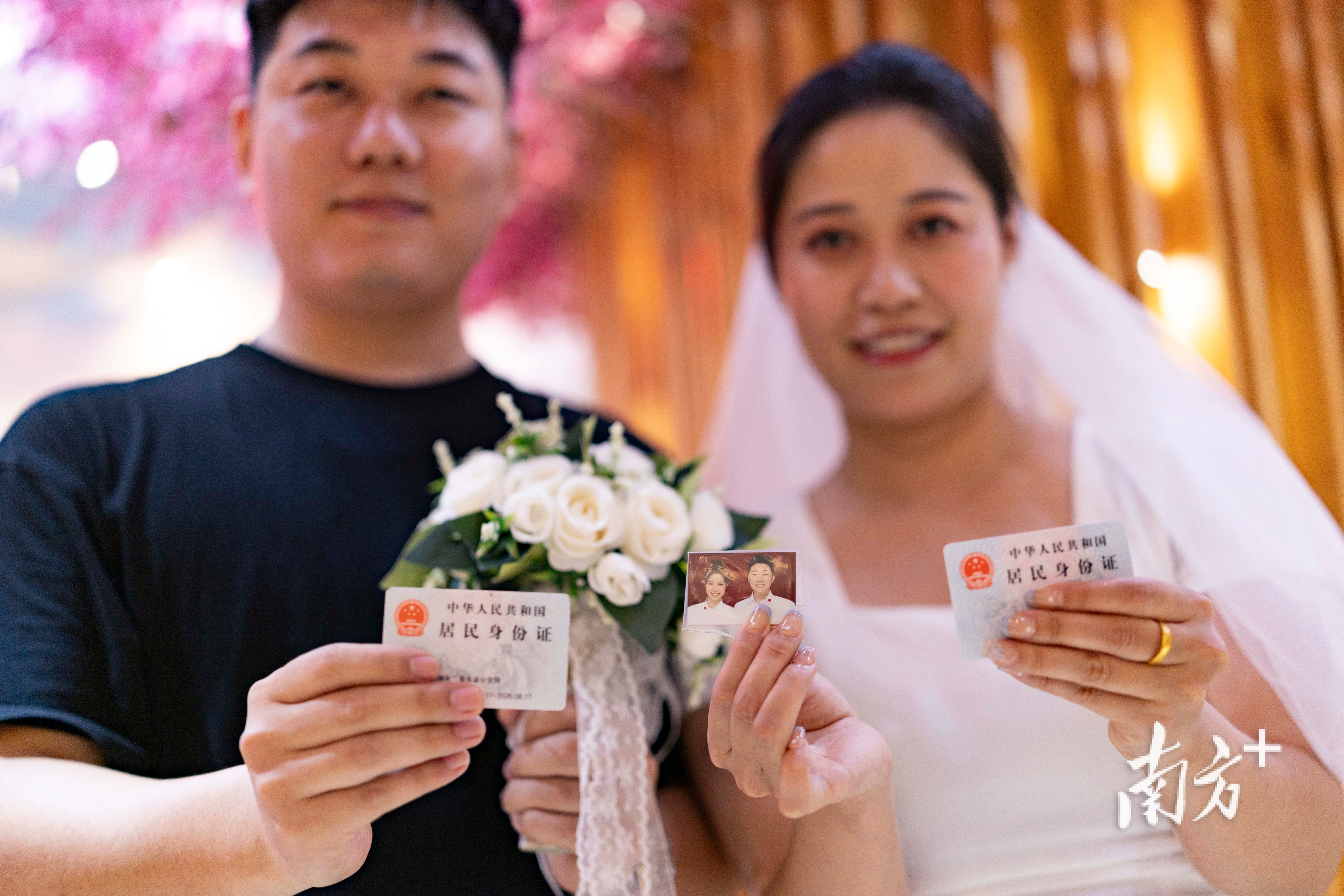 新人秀出今天前来登记结婚所准备的材料——身份证、结婚证件照。 南方+ 梁钜聪 拍摄