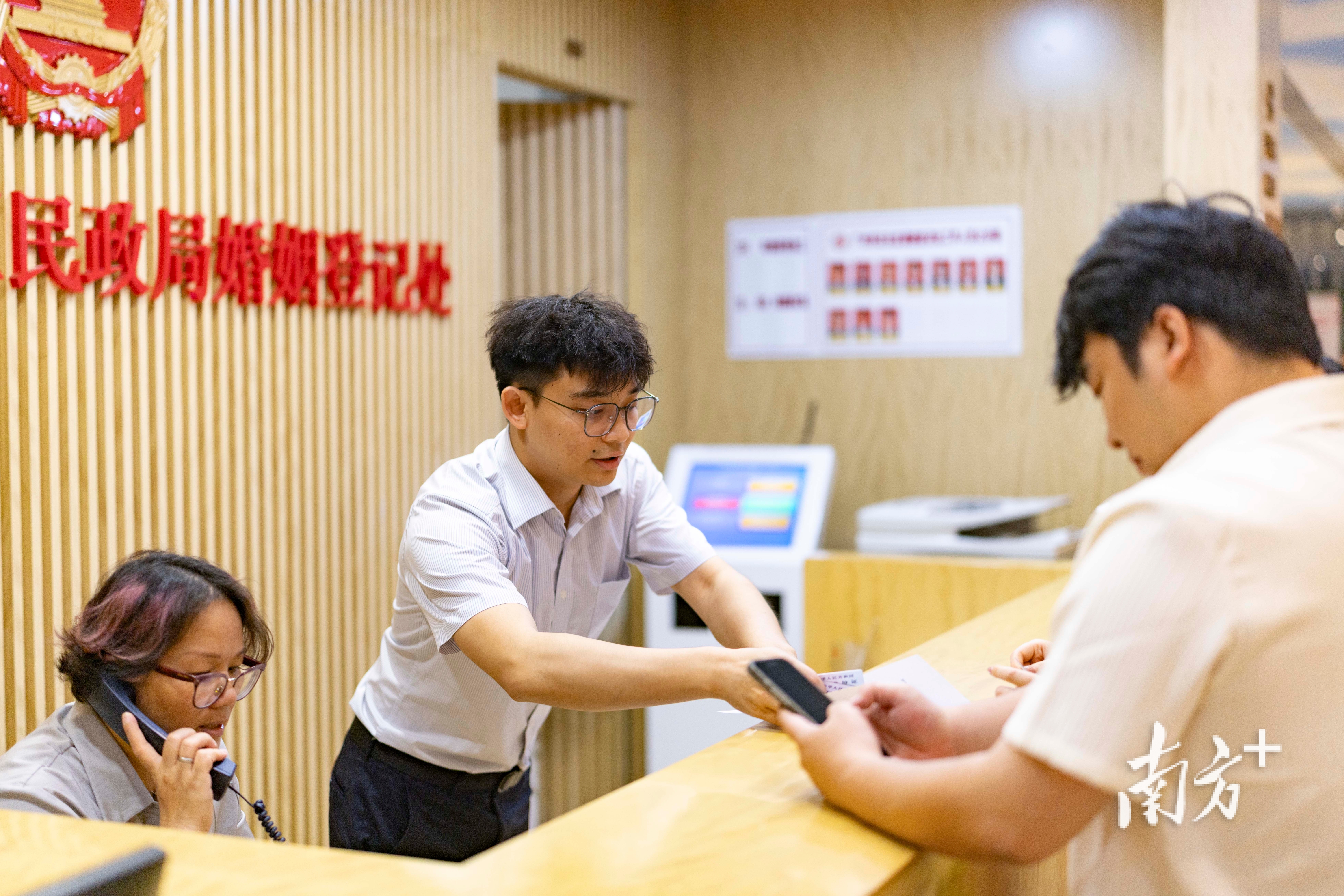 工作人员在前台接待前来登记的新人,并告知需要准备的材料。 南方+ 梁钜聪 拍摄