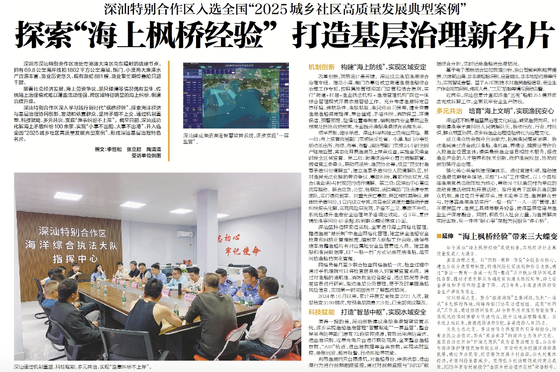 深汕特别合作区深入学习践行新时代“枫桥经验”,探索海洋经济与基层治理协同创新,发动和依靠群众、坚持矛盾不上交,通过机制重塑、科技赋能、多元共治,实现“渔事纠纷不上岸”。截至目前,深汕成功化解海上矛盾纠纷100余宗,实现“小事不出船、大事不出港”,并入选全国“2025城乡社区高质量发展典型案例”,形成深汕基层治理特色名片。