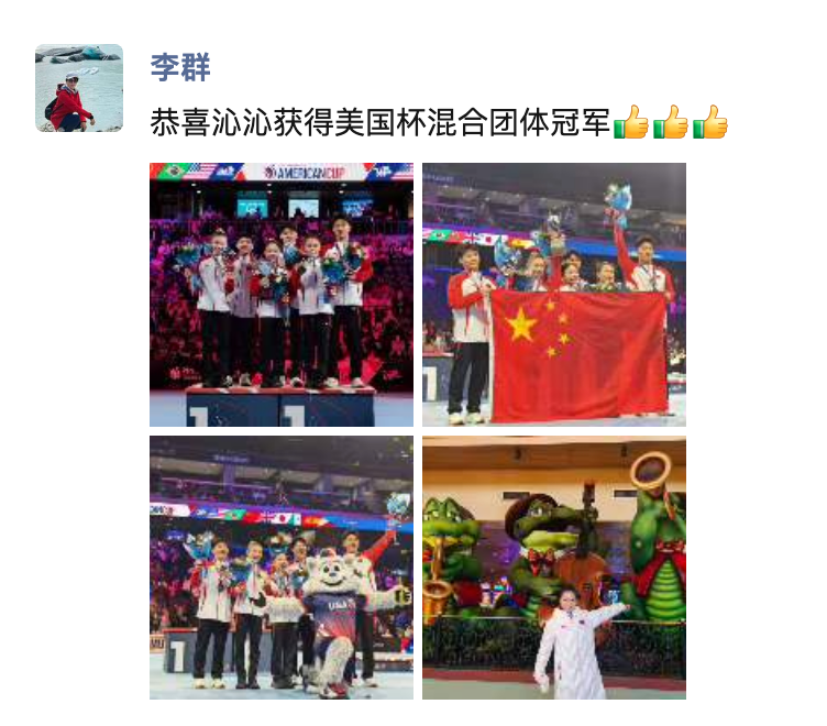 消息传来,启蒙教练李群第一时间在朋友圈写下:“恭喜沁沁获得美国杯混合团体冠军!”
