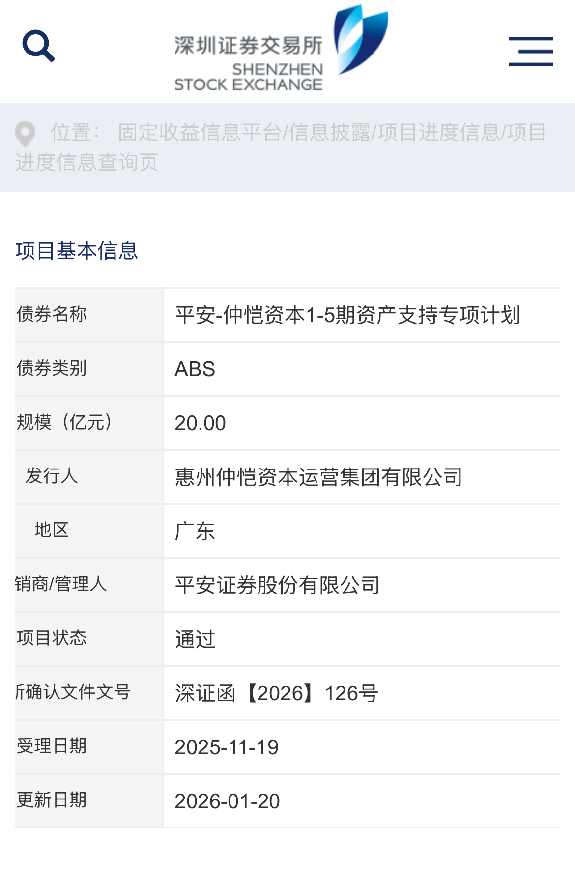 根据深圳证券交易所信息,“平安-仲恺资本1-5期资产支持专项计划”,申报总规模达20亿元,分5期发行。本期为第一期,发行规模6亿元(优先级),发行期限3+n年,票面利率2.28%。