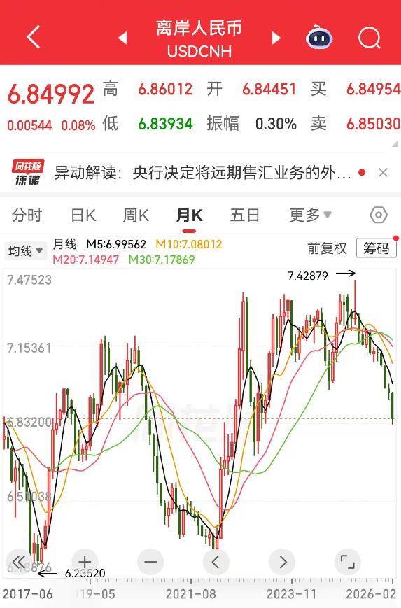 继近期人民币汇率持续强势上升后,央行2月27日宣布:自2026年3月2日起,将远期售汇业务的外汇风险准备金率从20%下调为0。这是时隔近三年半央行再次动用这一工具,意味企业远期购汇的成本将降低,利于增加购汇需求,这给人民币升值踩下了一脚“点刹”。而就在此前一日(2月26日),离岸人民币对美元汇率最高触及6.8267,一举创下近三年新高。