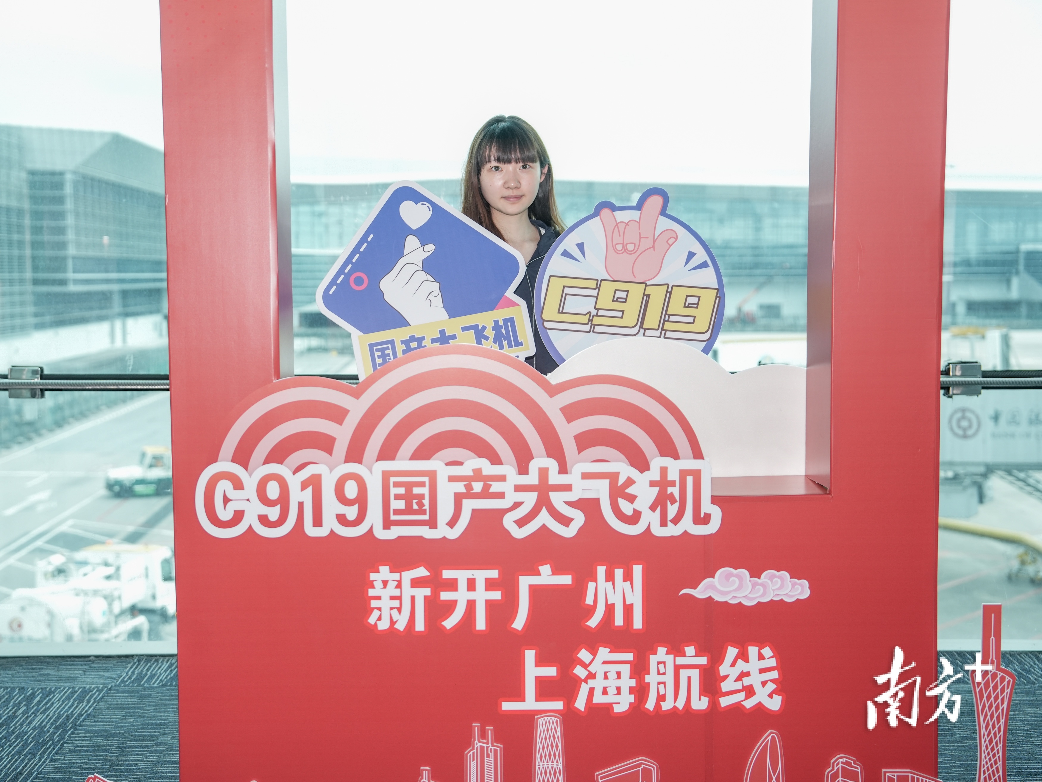 在广州白云机场,准备搭乘C919前往上海的乘客在留影板前拍照。