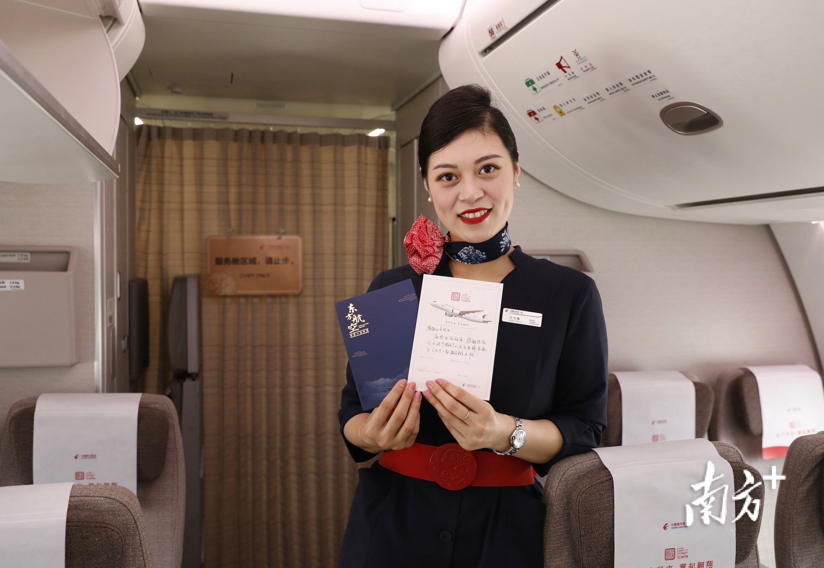 在今日的首航航班上,东航为旅客配备了具有岭南风味的“腊味煲仔饭”和海派风味的大白兔奶糖味牛奶、蝴蝶酥等点心,旅客还可观看充满“中国风”的安全演示视频,使用带有“C919中国印”的特制机供品,品尝“东航那杯茶”,深度感受东航“四精”服务。特别值得一提的是,今天的首航航班有一名王姓旅客过生日,机组贴心地为他手写了一封祝福贺卡,感谢旅客选择乘坐中国东方航空,“在这个特别的日子里与C919一起翱翔天际”。