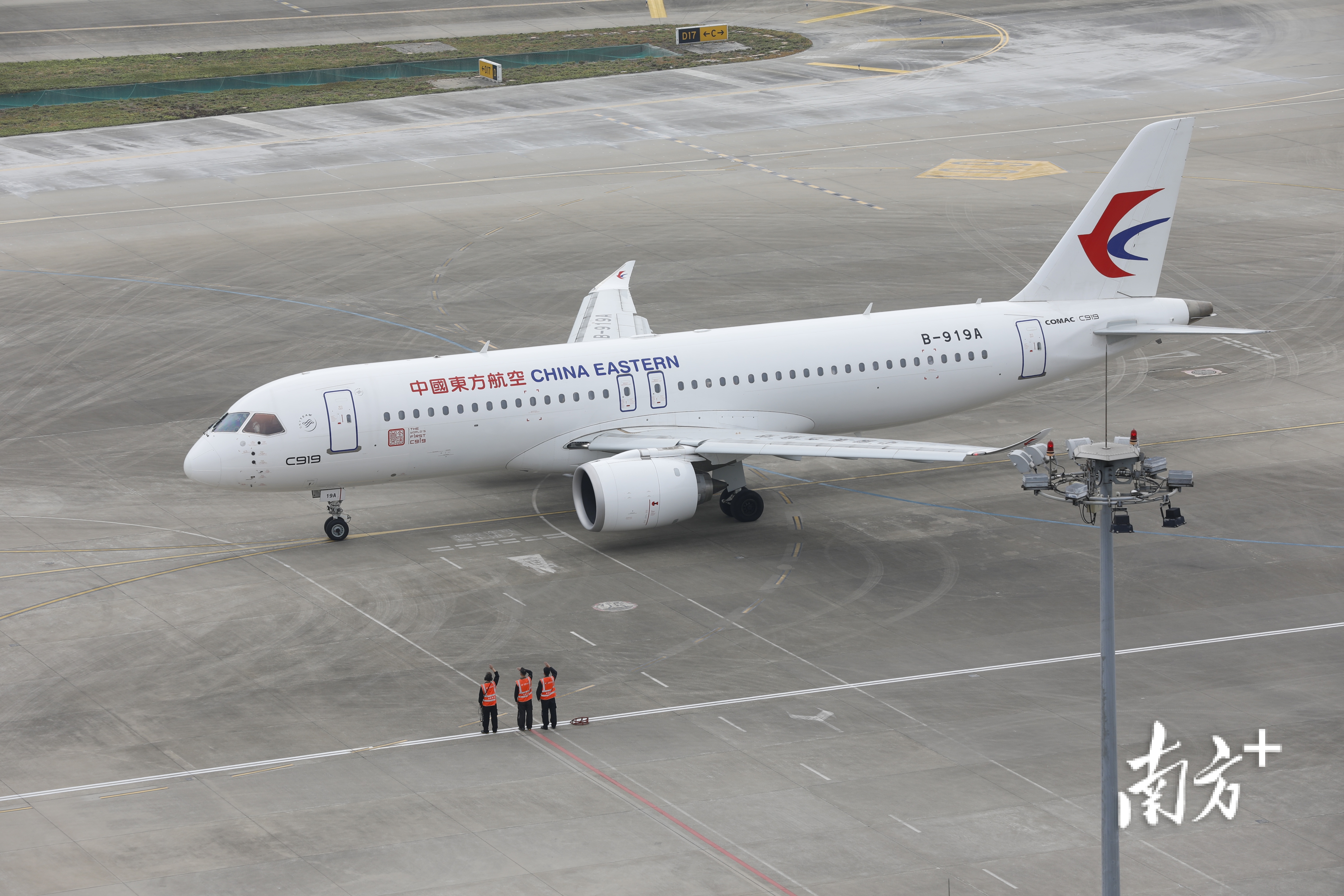 6月14日上午9:37,机号为B-919A的东航全球首架C919客机执行MU5309航班,搭载162名旅客,从上海虹桥机场飞往广州白云机场。
