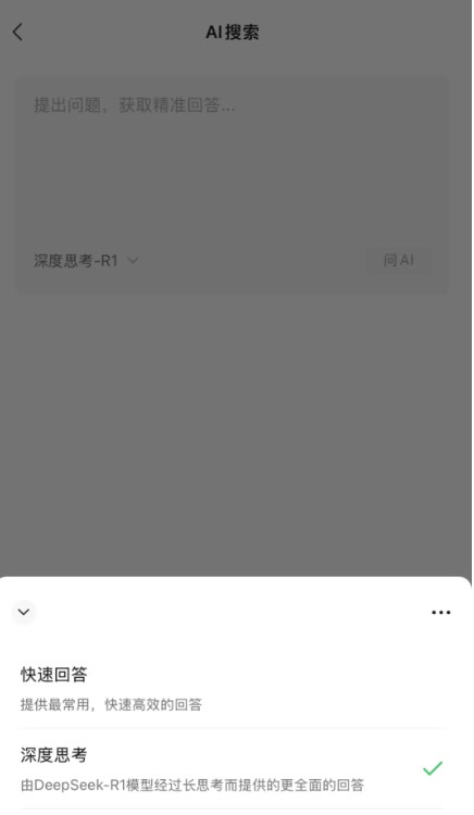 据介绍,该入口在微信首页上方的搜索框,用户点开会出现一个“AI搜索”功能。由于处于灰度测试状态,只有部分被选中的用户可以看到。在AI搜索栏输入内容后,用户可选择“深度思考”,即DeepSeek- R1模型,在“快速回答”功能外,获得经过长思考而提供的更全面回答。