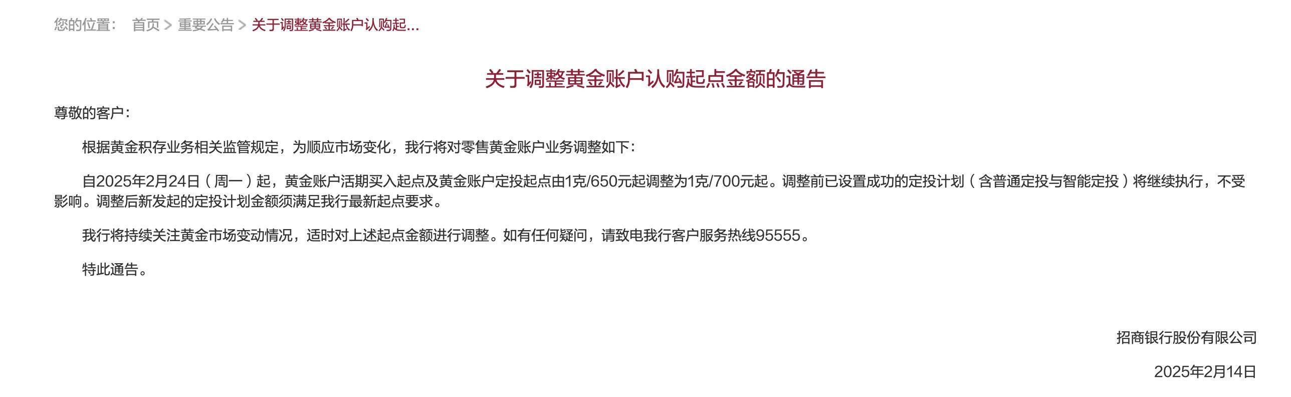 招商银行通告称,自2025年2月24日(周一)起,黄金账户活期买入起点及黄金账户定投起点由1克/650元起调整为1克/700元起。调整前已设置成功的定投计划(含普通定投与智能定投)将继续执行,不受影响。