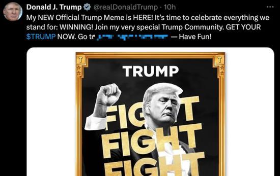 推文表示:“是时候庆祝我们的胜利了!加入我的‘特朗普社区(Trump Community)’。拿到你的TRUMP代币。玩得开心!”