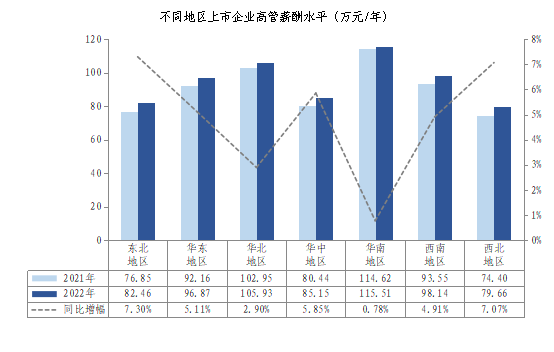 地区间薪酬格局保持不变,东北、西北地区高管薪酬增长显著。从地区分布来看,各地区高管薪酬水平同比均有不同程度的提升。其中,华南地区上市企业高管薪酬依然处于领先地位,平均年薪为115.51万元/年,同比增长0.78%;华北地区保持第二,平均年薪为105.93万元/年,同比增长2.90%,增幅较去年相比有所放缓;西南地区仍位居第三,为98.14万元/年,同比增长4.91%,增幅与去年基本一致;东北地区与西北地区的薪酬水平虽然在地区中排名靠后,但增幅较高,分别为7.30%、7.07%。